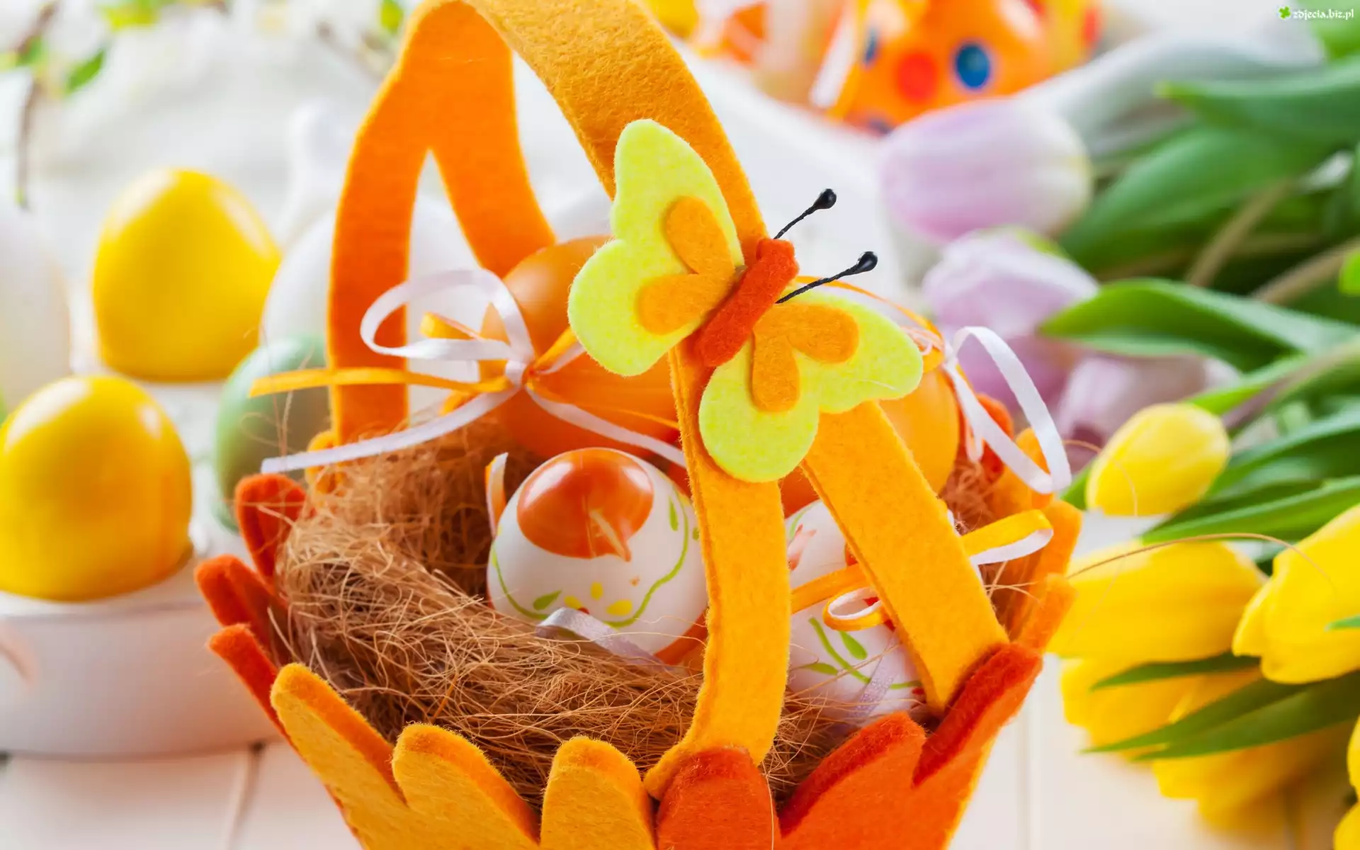 Zdjęcie Wielkanoc, Jajka, Pisanki, Tulipany, Kwiaty, Koszyk