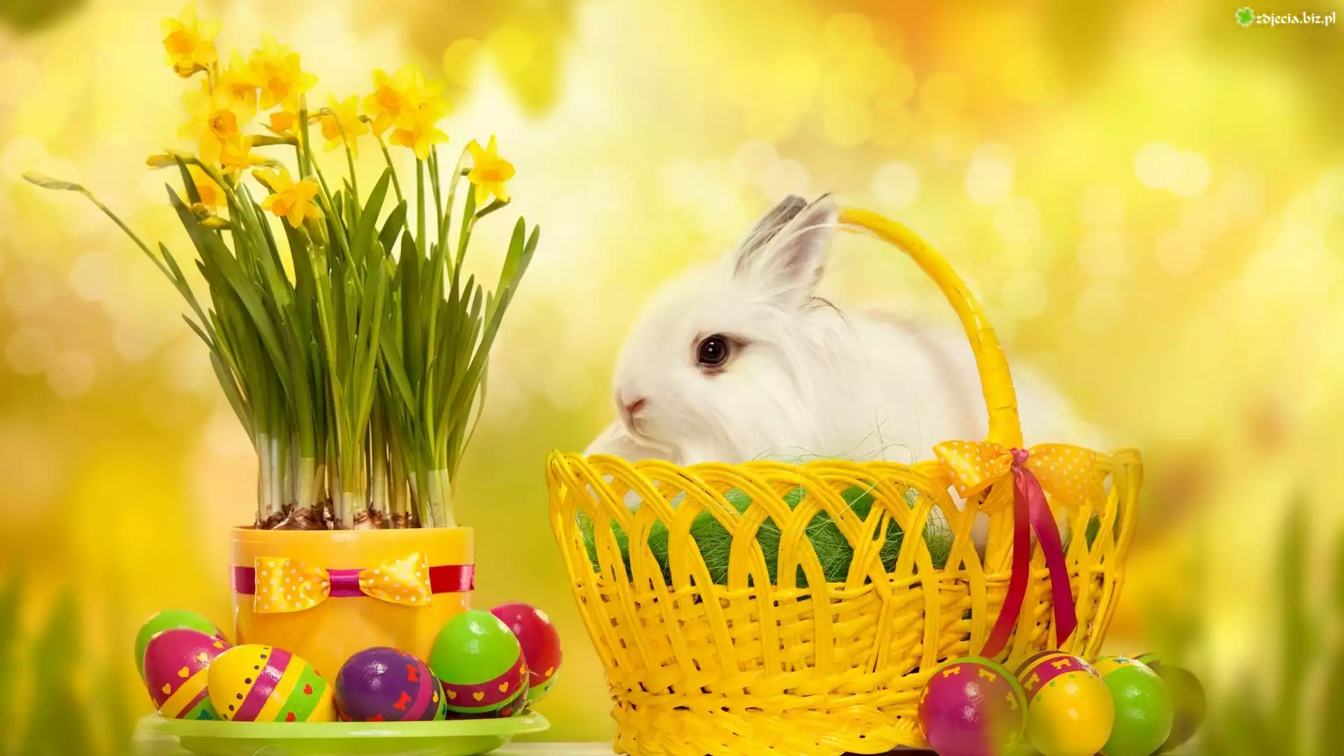 Zdjęcie Wielkanoc, Zając, Pisanki, Żonkile, Koszyczek