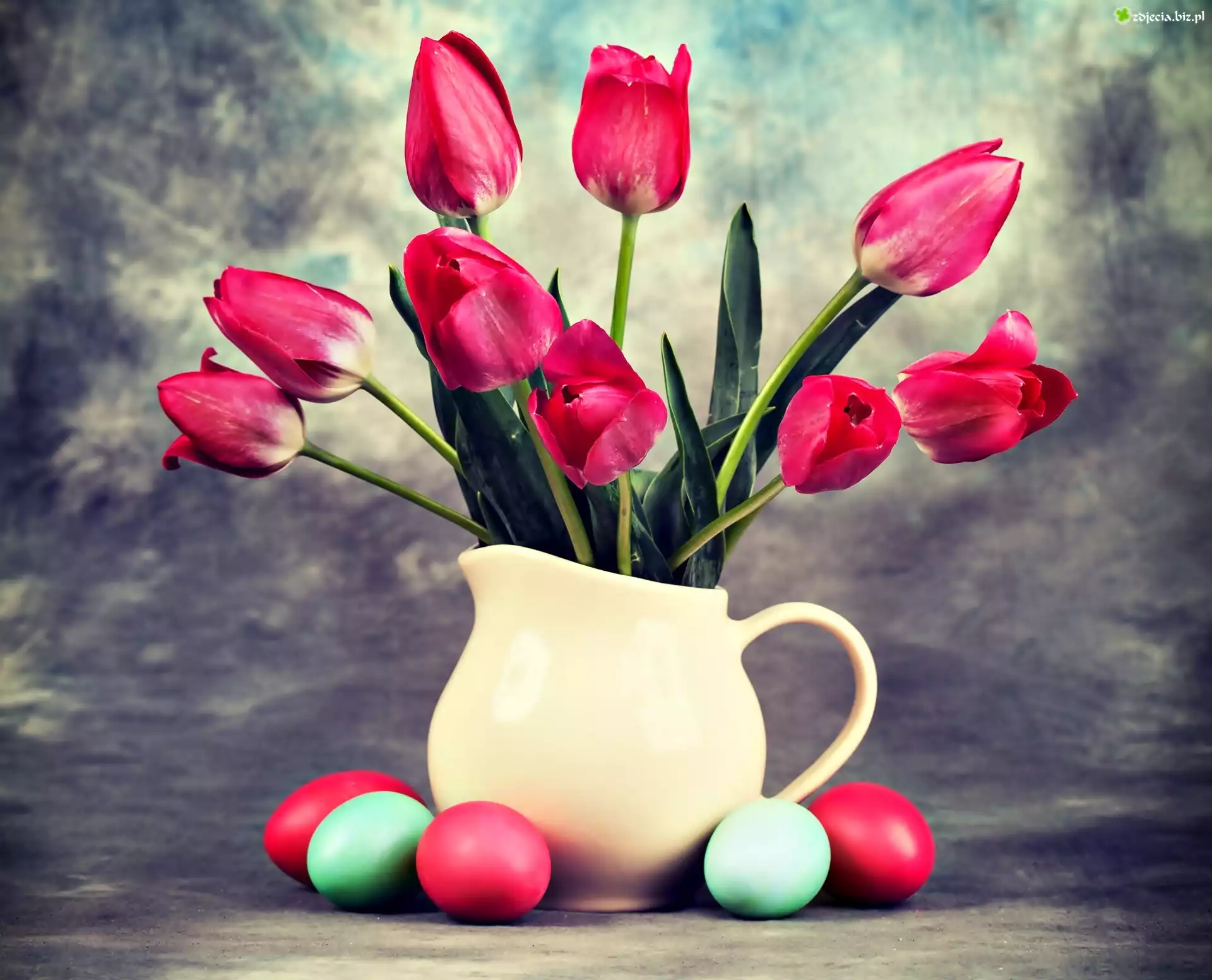 Zdjęcie Wielkanoc, Pisanki, Bukiet, Tulipany, Dzbanek