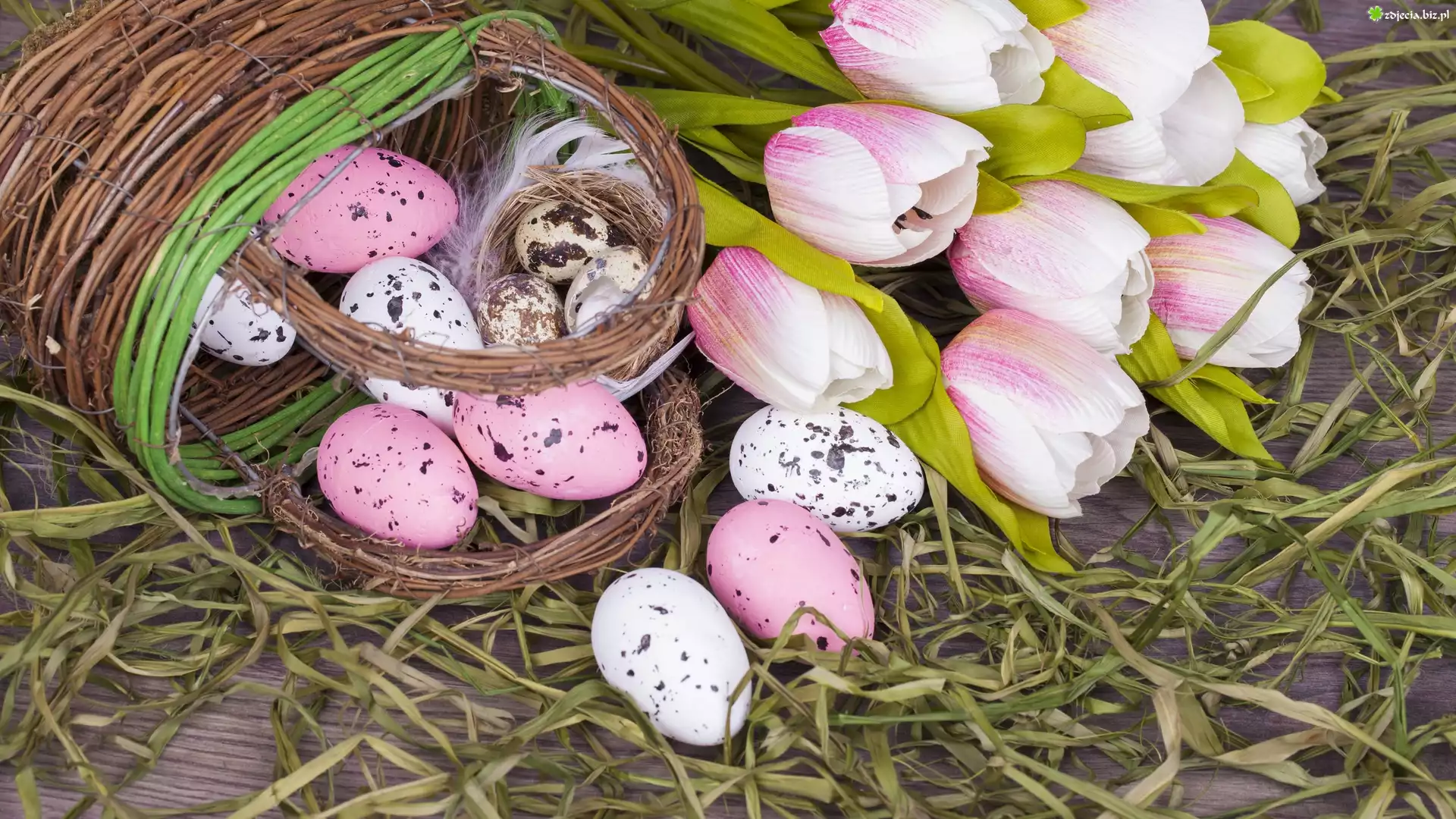 Zdjęcie Wielkanoc, Kompozycja, Koszyk, Pisanki, Tulipany, Siano