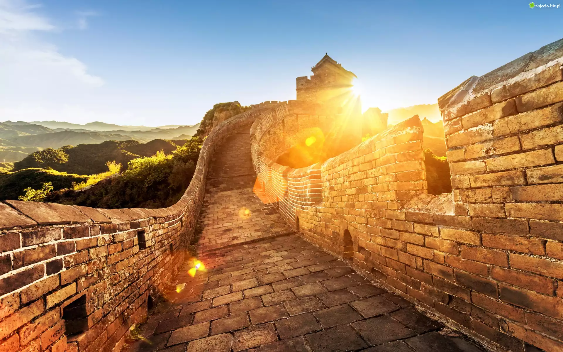 Zdjęcie Chiny, Wielki Mur Chiński, Wschód słońca, Promienie, Góry