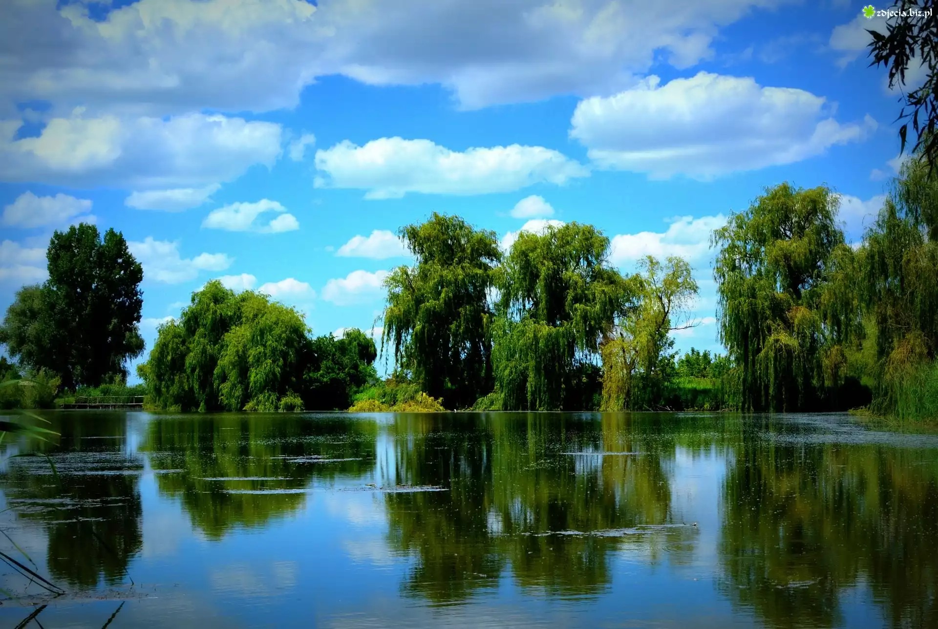 Zdjęcie Wierzby, Jezioro, Odbicie, Niebo, Obłoki
