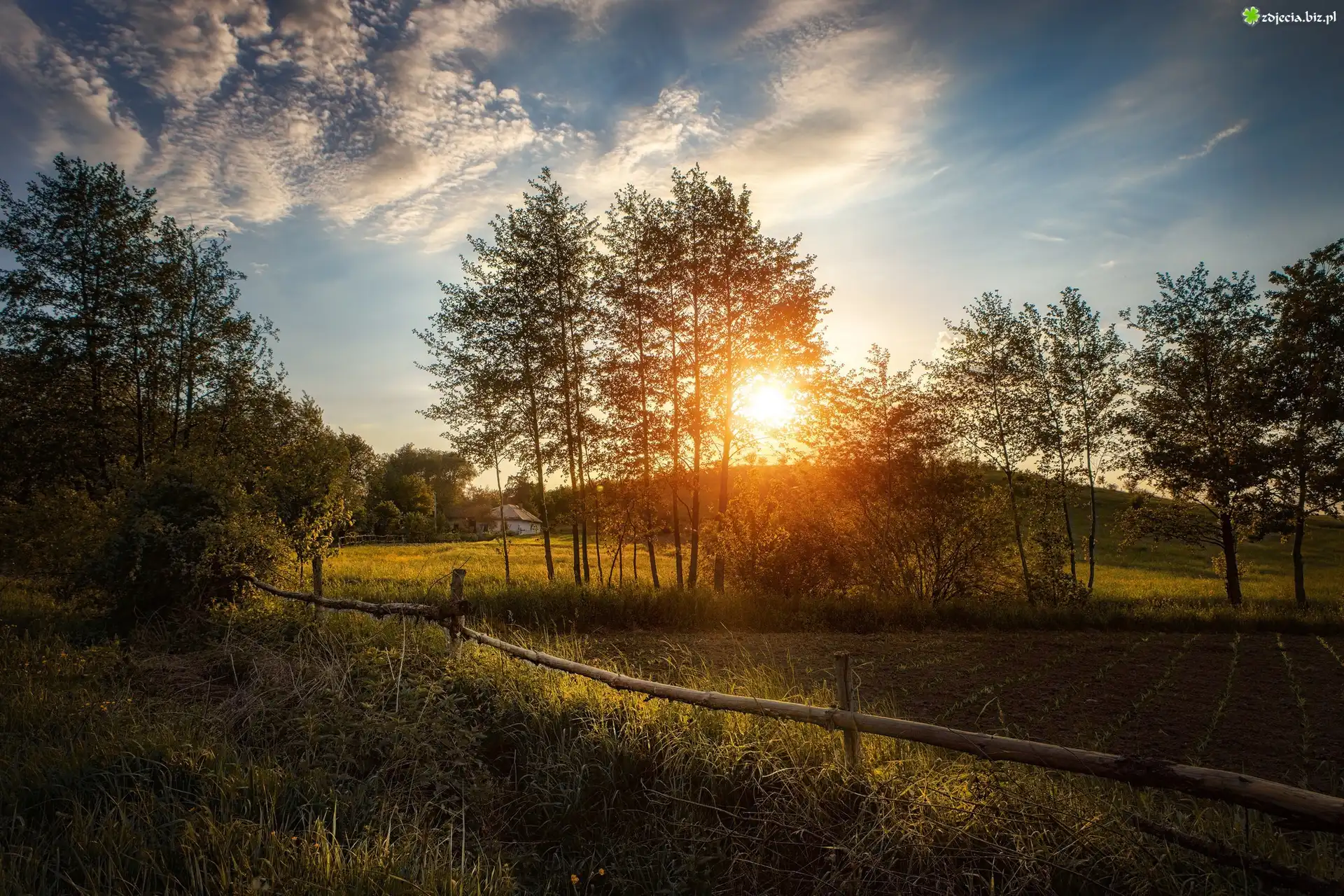 Zdjęcie Łąka, Drzewa, Roślinność, Wschód słońca, Chmury, Domek, Wieś