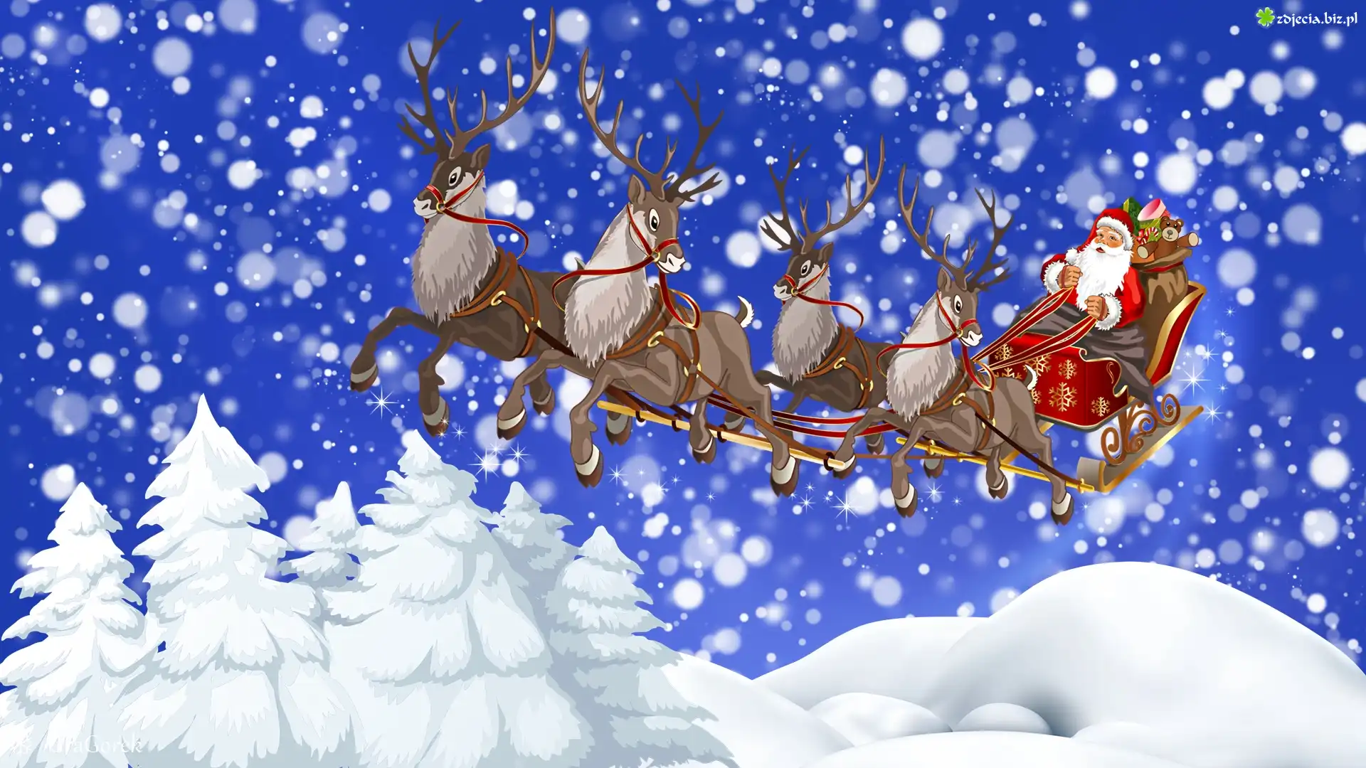 Zdjęcie Święta, Mikołaj, Sanie, Renifery, Świerki, Śnieg, Grafika