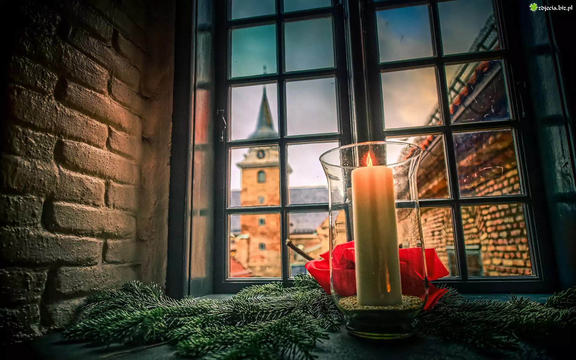 Zdjęcie Wieża, Okno, Świeca, Płomień, Gałązki, Świerka