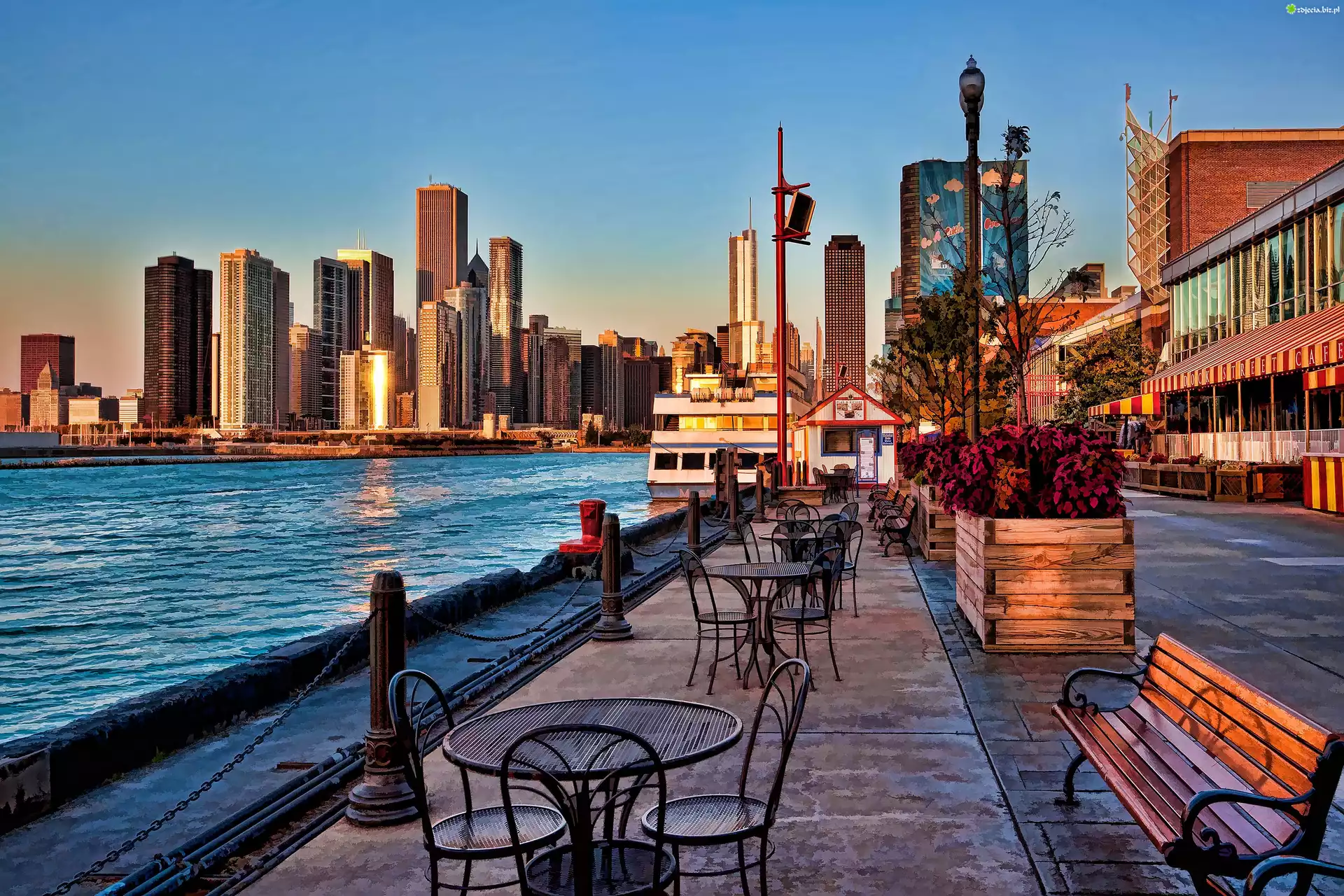 Zdjęcie, Wieżowce, Bulwar, Stoliki, Chicago, USA