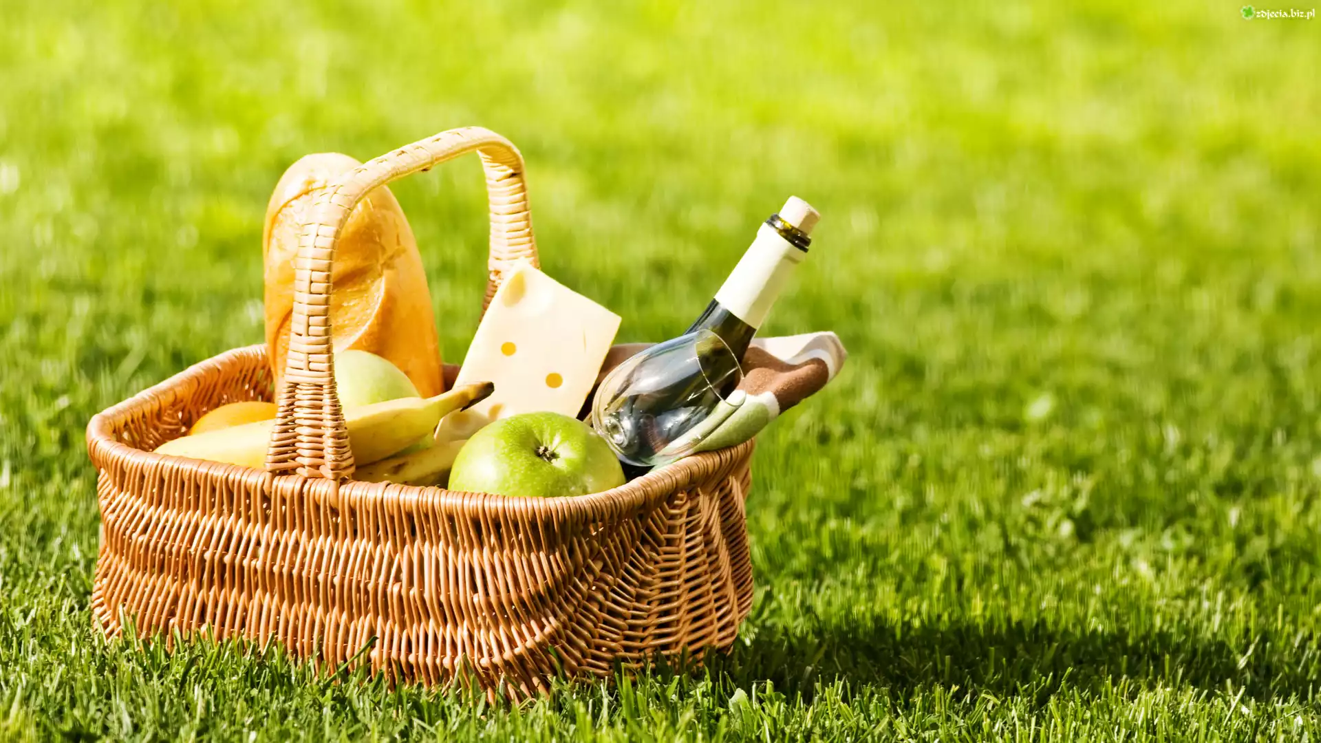 Zdjęcie Piknik, Wiklinowy, Koszyk, Jabłko, Wino, Banan, Pieczywo