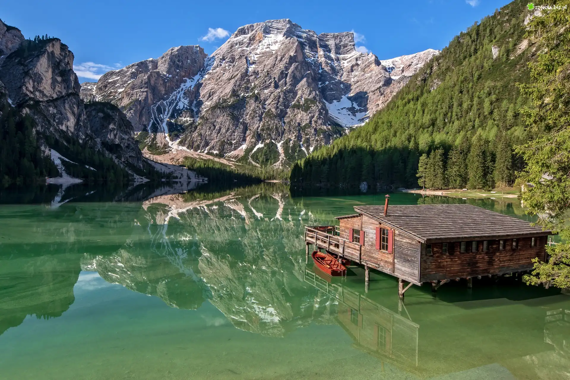 Zdjęcie Włochy, Południowy Tyrol, Jezioro Pragser Wildsee, Góry, Dolomity, Drewniany, Dom, Łódki, Drzewa |