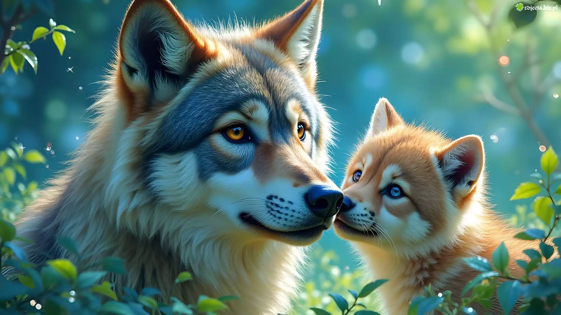 Zdjęcie Stary, Wilk, Młody, Wilk, Gałęzie