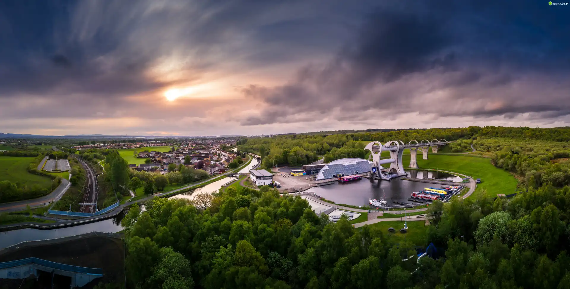 Zdjęcie Jezioro, Rzeka, Falkirk Wheel, Śluza, Winda, Łodzie, Drzewa, Wschód słońca, Falkirk, Szkocja |