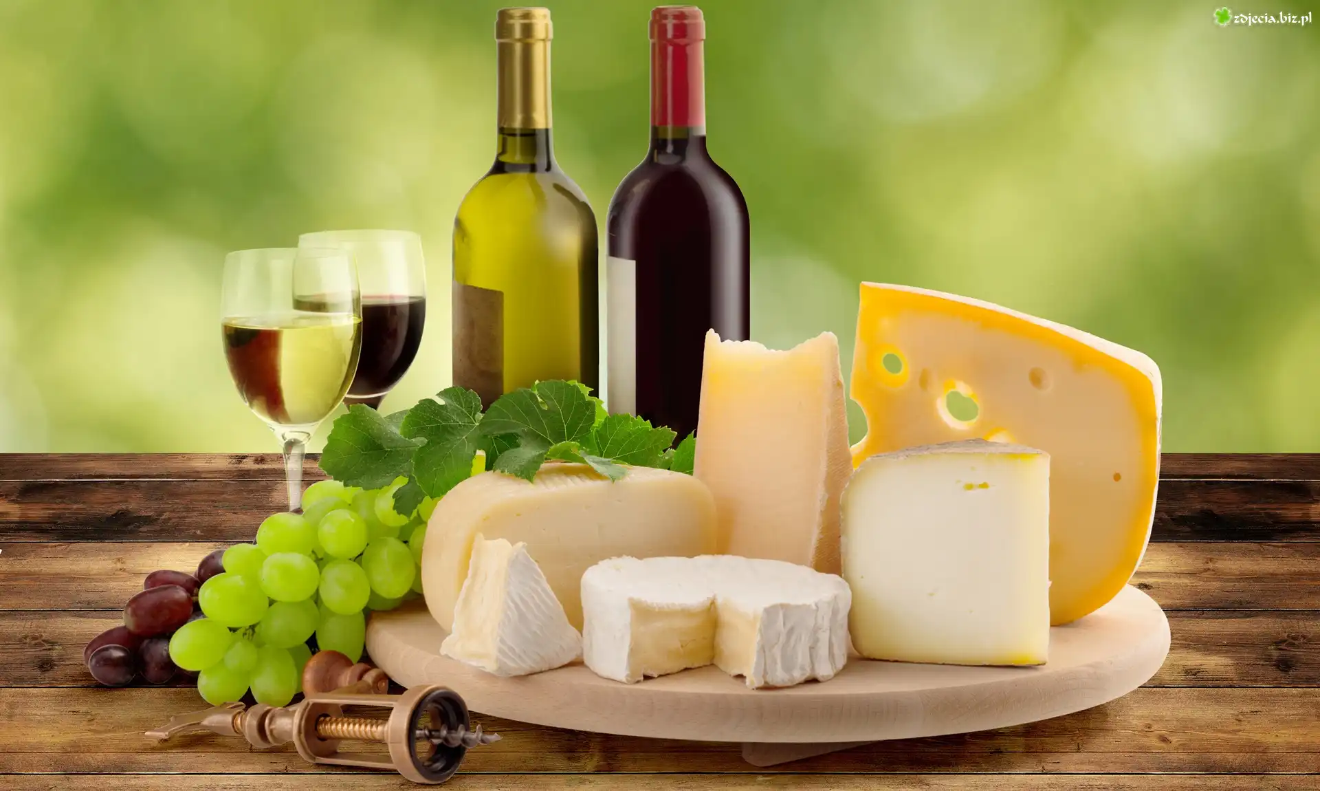 Zdjęcie Butelki, Wino, Kieliszki, Deska, Sery, Winogrona, Kompozycja