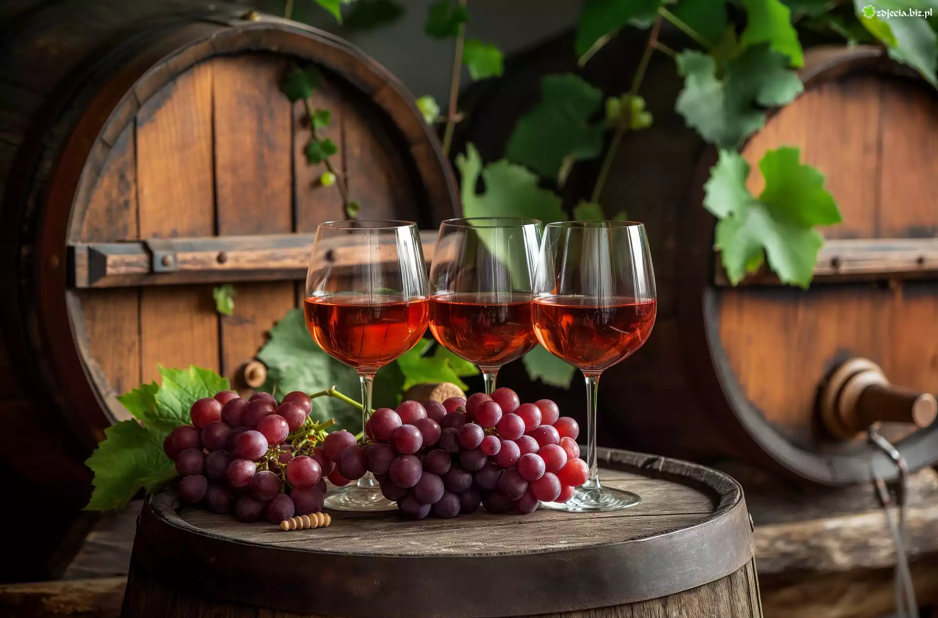 Zdjęcie Kieliszki, Wino, Owoce, Winogrona, Beczki
