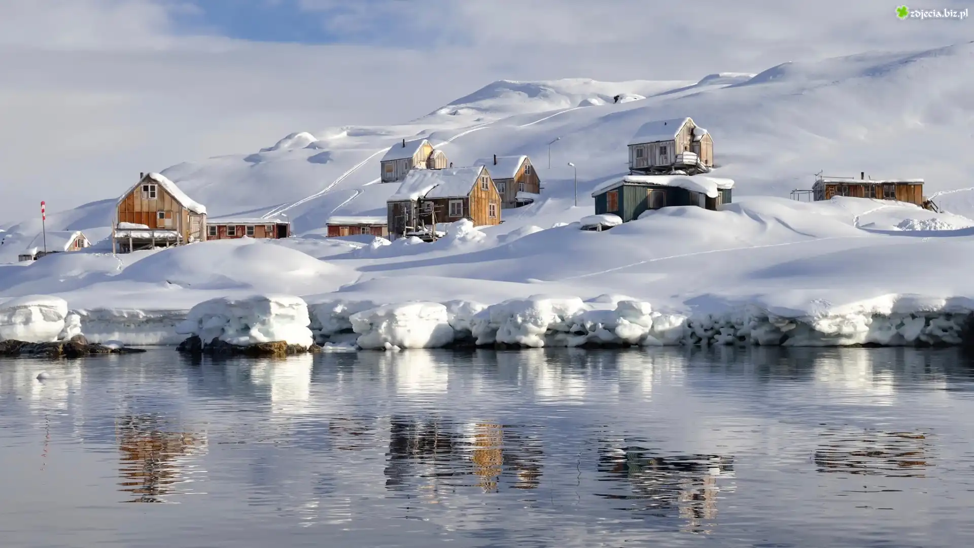 Zdjęcie Grenlandia, Wioska, Domy, Góry, Morze, Śnieg, Odbicie