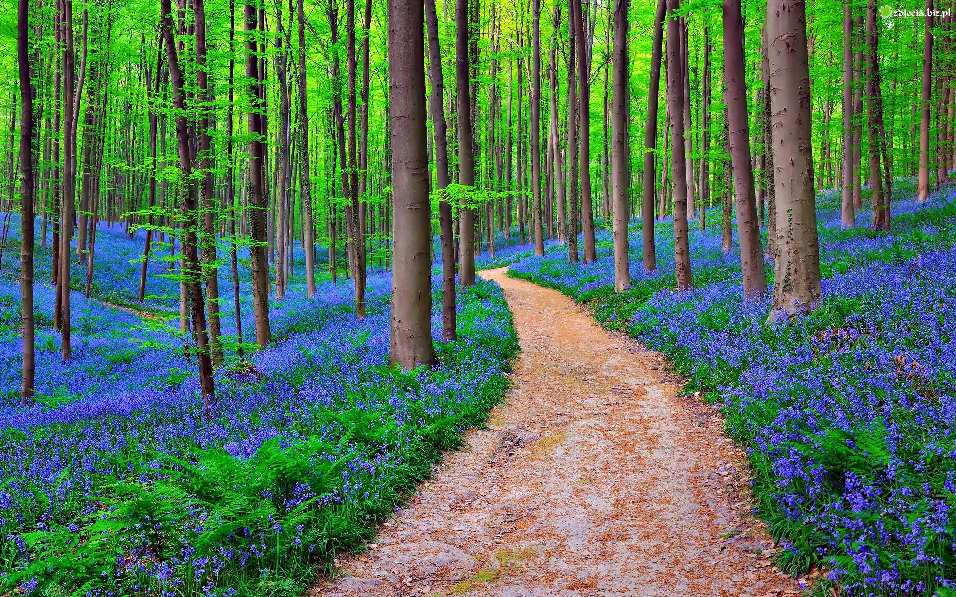 Zdjęcie Wiosna, Las, Ścieżka, Fioletowe, Kwiaty