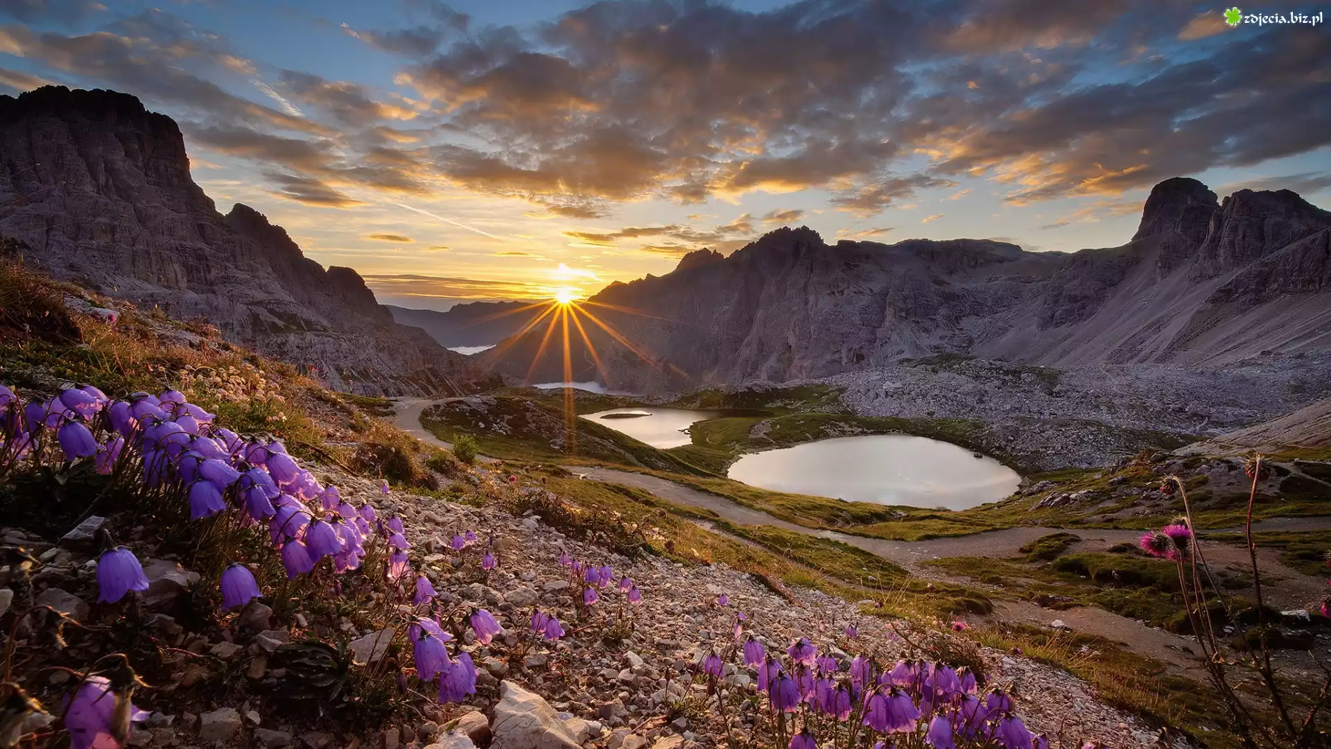 Zdjęcie Góry, Skały, Jeziora, Kwiaty, Chmury, Promienie słońca, Wiosna