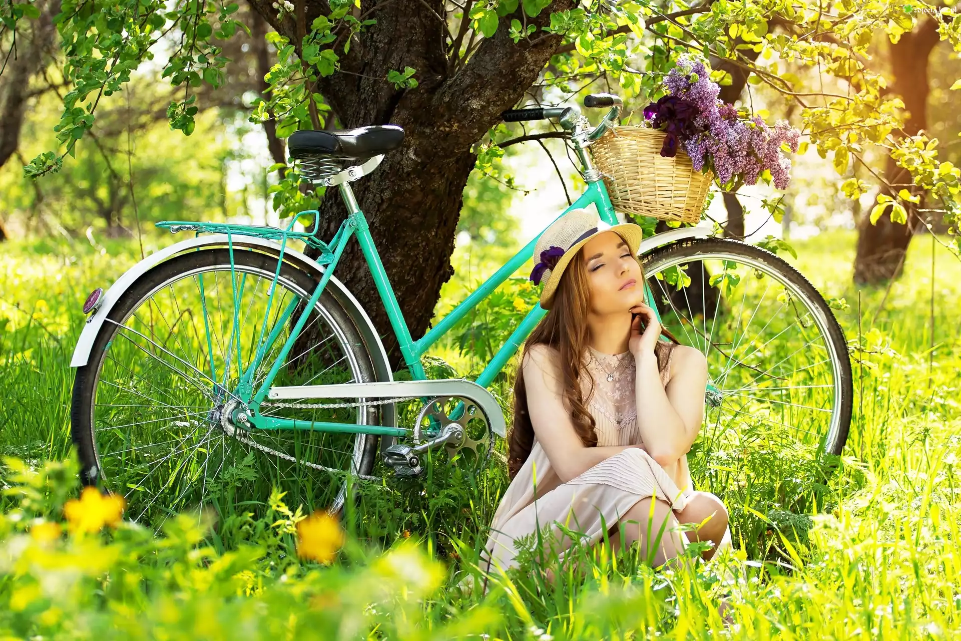 Zdjęcie Dziewczyna, W, Kapeluszu, Rower, Koszyk, Bez, Odpoczynek, Park, Wiosna