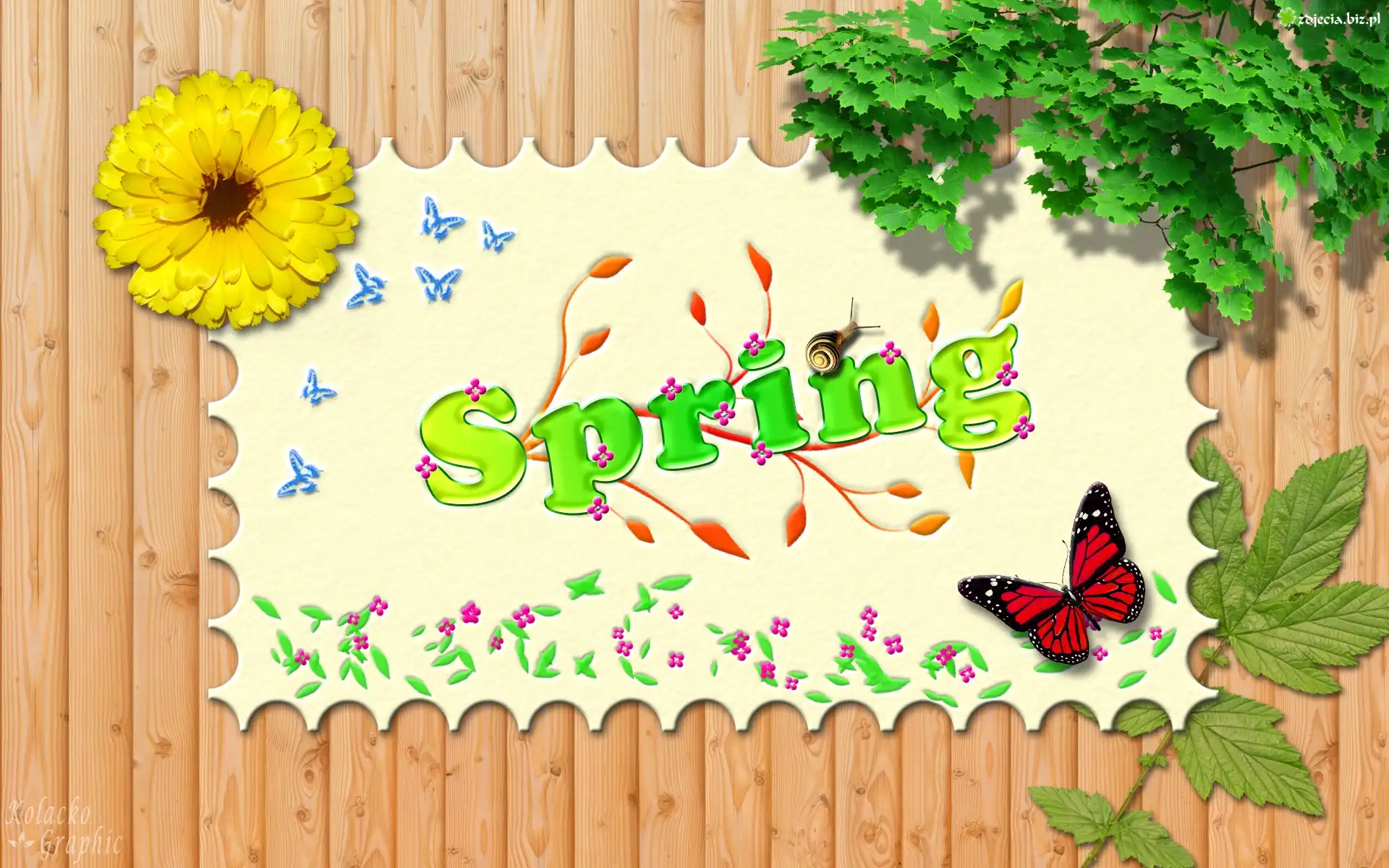 Zdjęcie Wiosna, Napis, Motylki, Kwiat, Liście