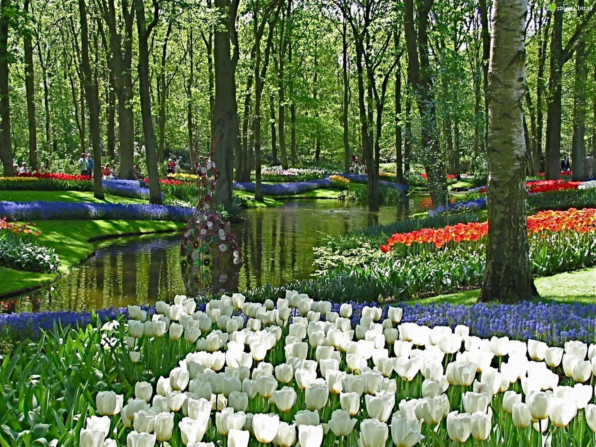Zdjęcie Wiosna, Park, Rzeczka, Dywany, Kwiatowe, Spacerowicze