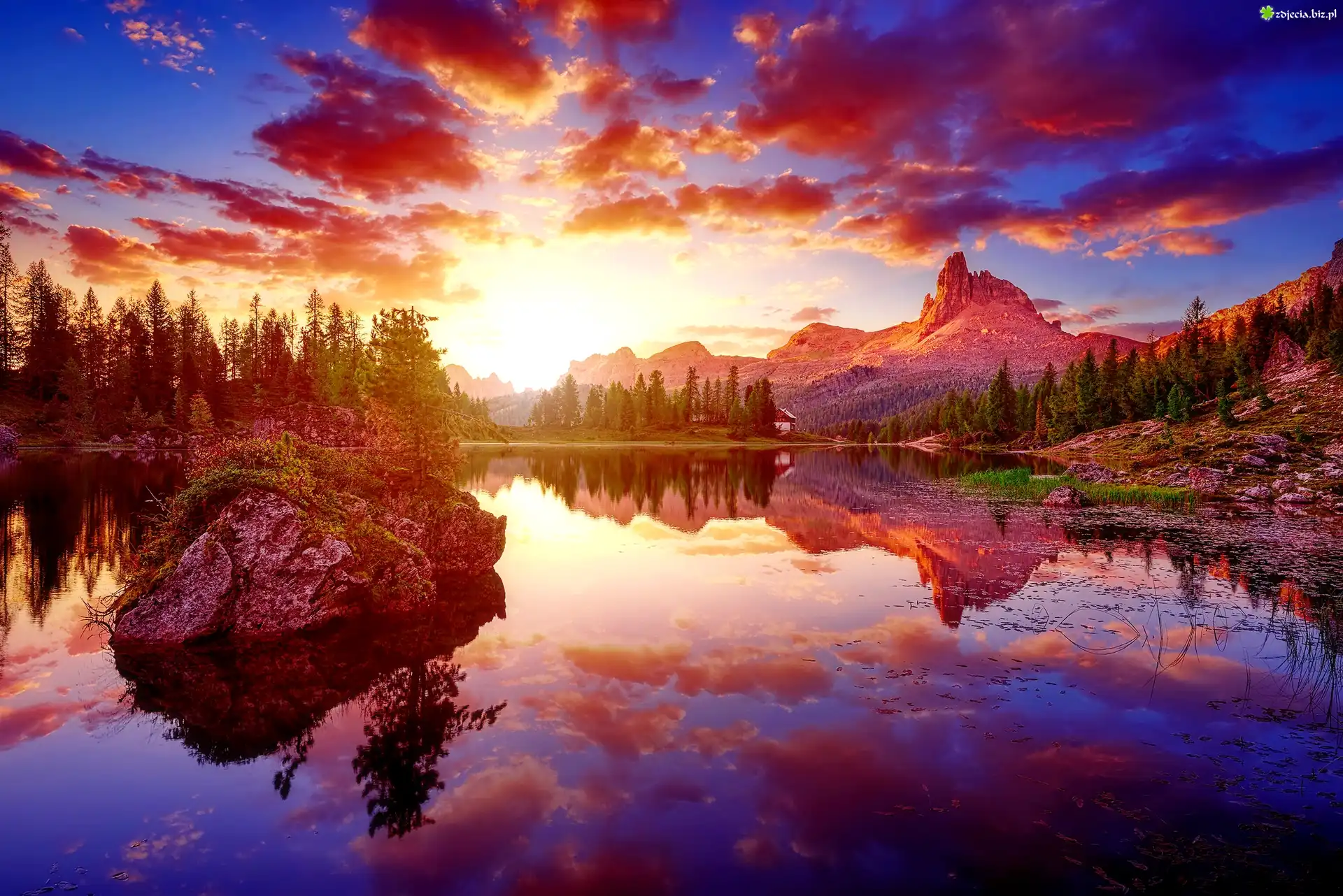 Zdjęcie Włochy, Cortina d’Ampezzo, Jezioro Federa, Góry, Skały, Wschód słońca, Chmury, Drzewa