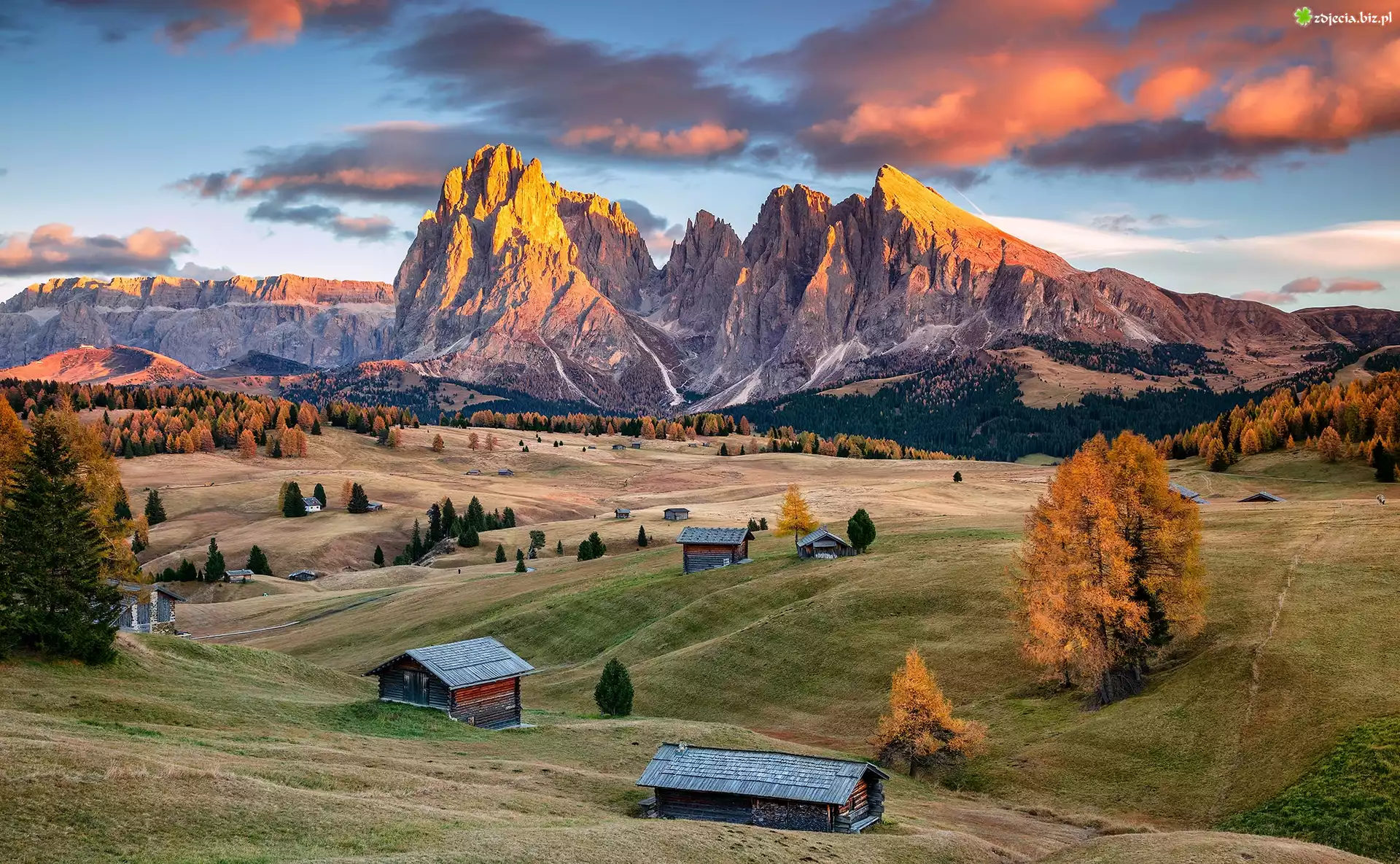 Zdjęcie Włochy, Płaskowyż Seiser Alm, Dolina Val Gardena, Góry Sassolungo, Dolomity, Domy, Drzewa, Chmury |