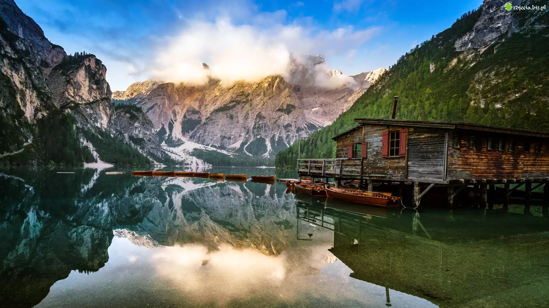 Zdjęcie Włochy, Południowy Tyrol, Jezioro, Pragser Wildsee, Lago di Braies, Góry, Dolomity, Pomost, Drewniany, Domek, Łódki |