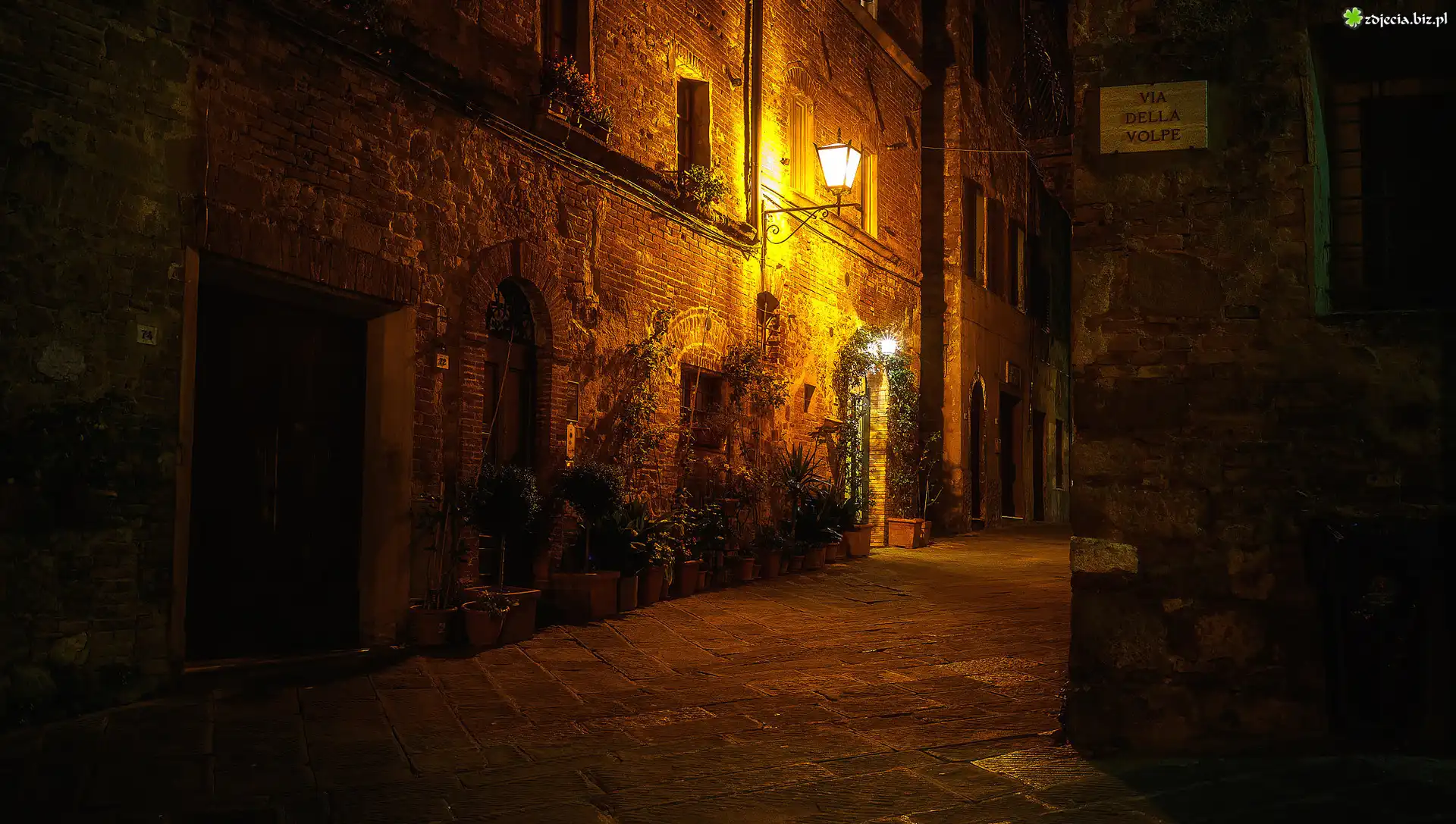Zdjęcie, Włochy, Toskania, Oświetlona, Uliczka, Domy, Latarnia
