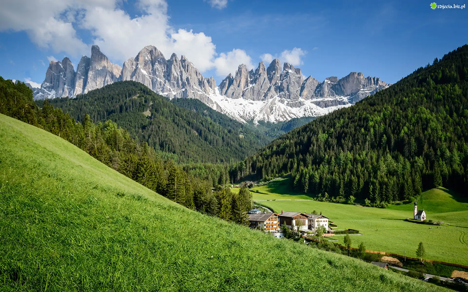 Zdjęcie Włochy, Południowy Tyrol, Góry, Dolomity, Masyw Odle, Wieś, Santa Maddalena, Dolina Val di Funes, Drzewa, Trawa |