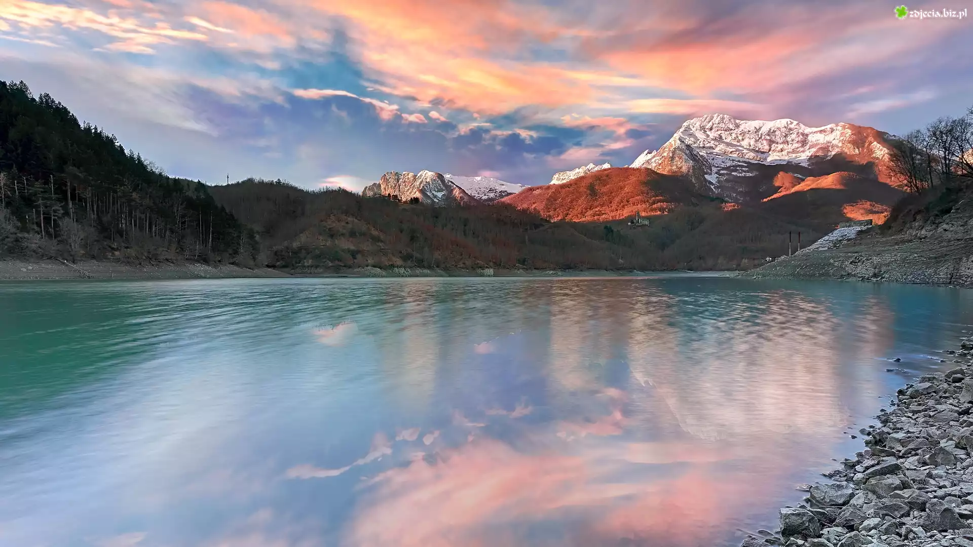 Zdjęcie, Jezioro, Lago di Gramolazzo, Góry, Las, Chmury, Prowincja Lukka, Włochy