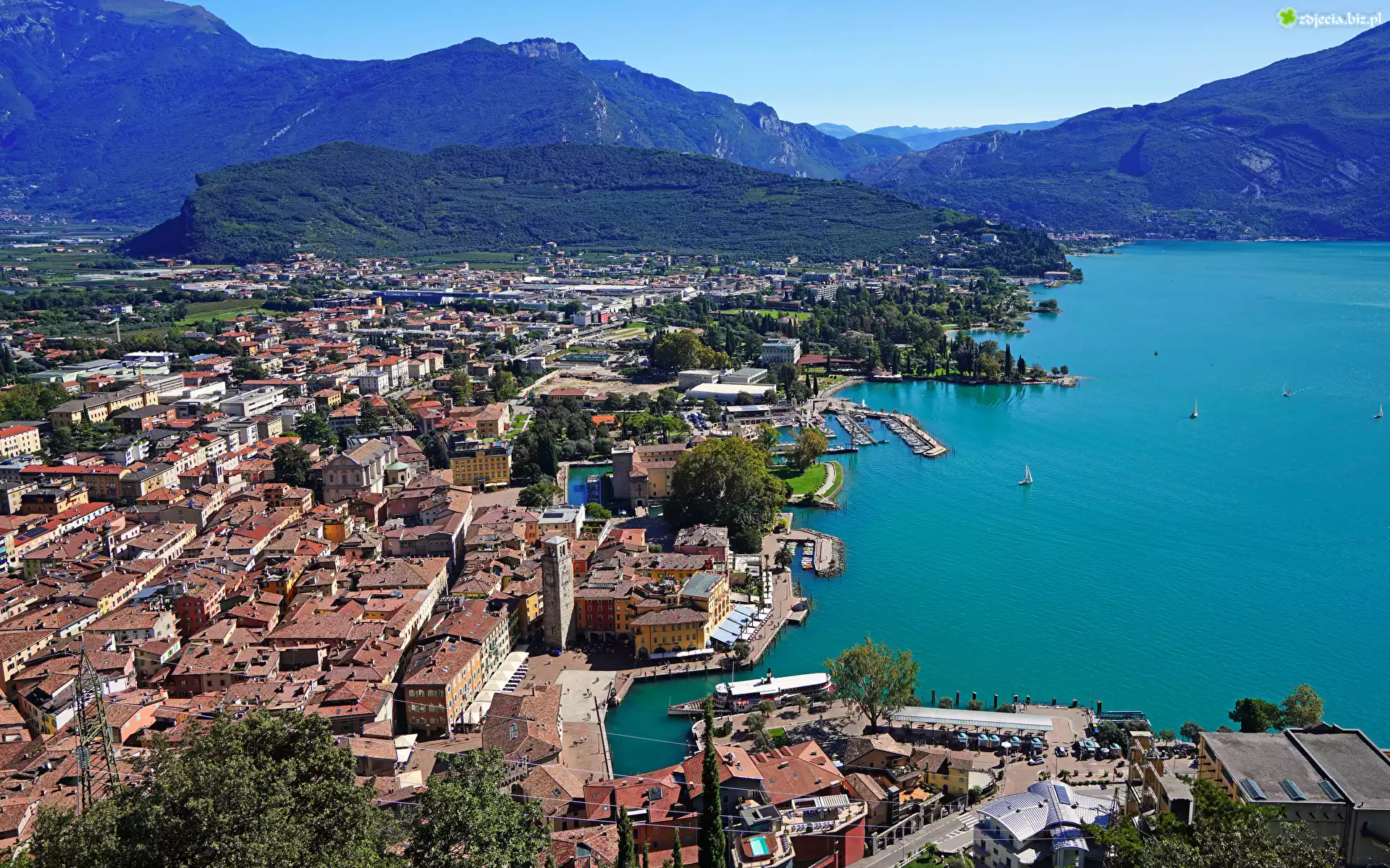 Zdjęcie Włochy, Góry, Alpy, Las, Drzewa, Miasto, Riva del Garda, Domy, Jezioro, Lake Garda