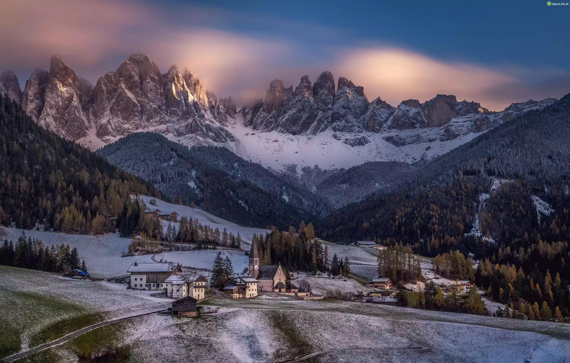 Zdjęcie, Włochy, Dolomity, Santa Maddalena, Góry, Alpy, Kościół, Domy, Las, Zima