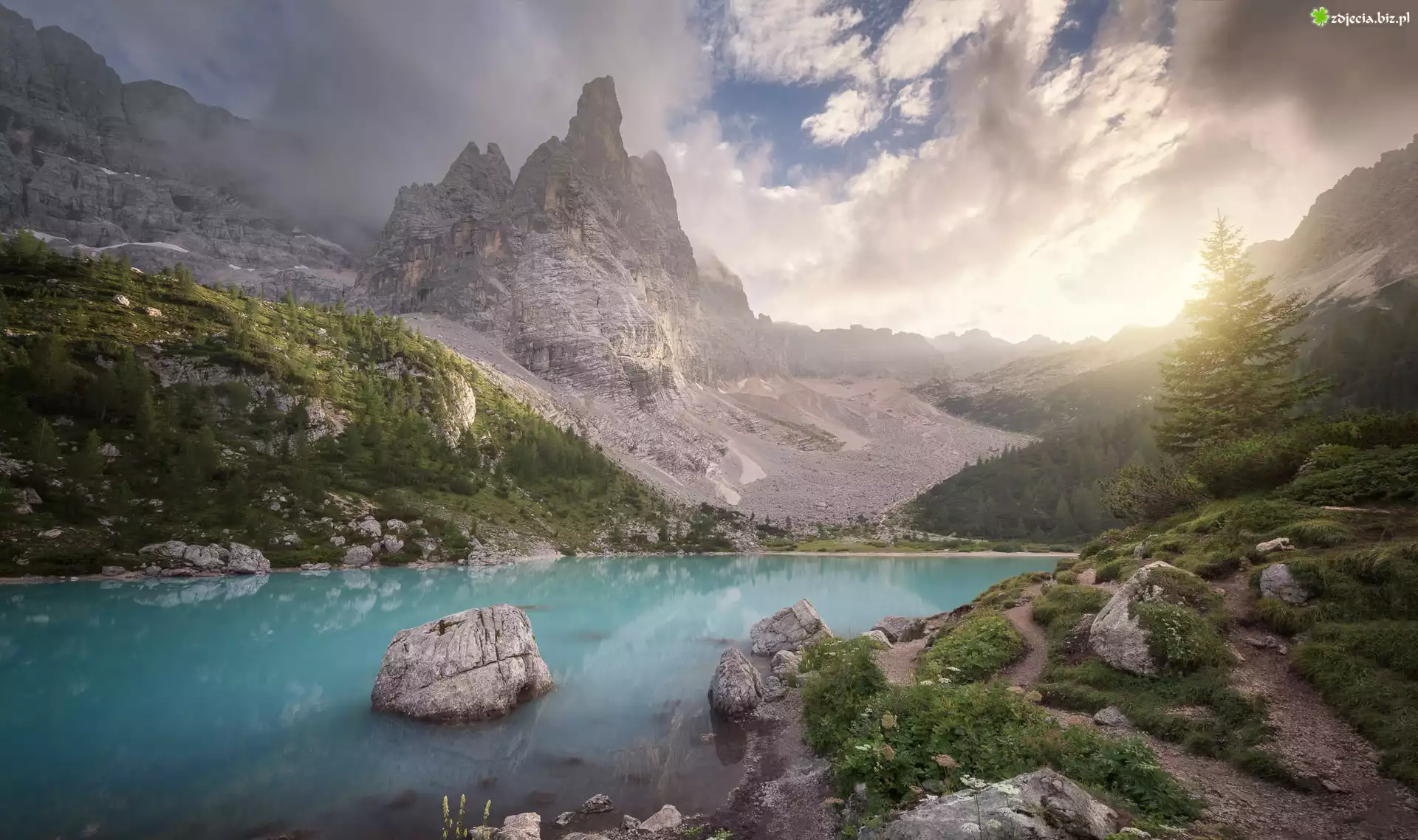 Zdjęcie, Góry, Dolomity, Masyw Sorapiss, Jezioro Sorapis, Mgła, Kamienie, Włochy