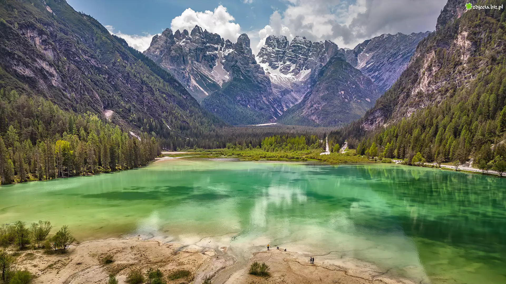 Zdjęcie Góry, Dolomity, Niebo, Las, Drzewa, Jezioro Durrensee, Włochy