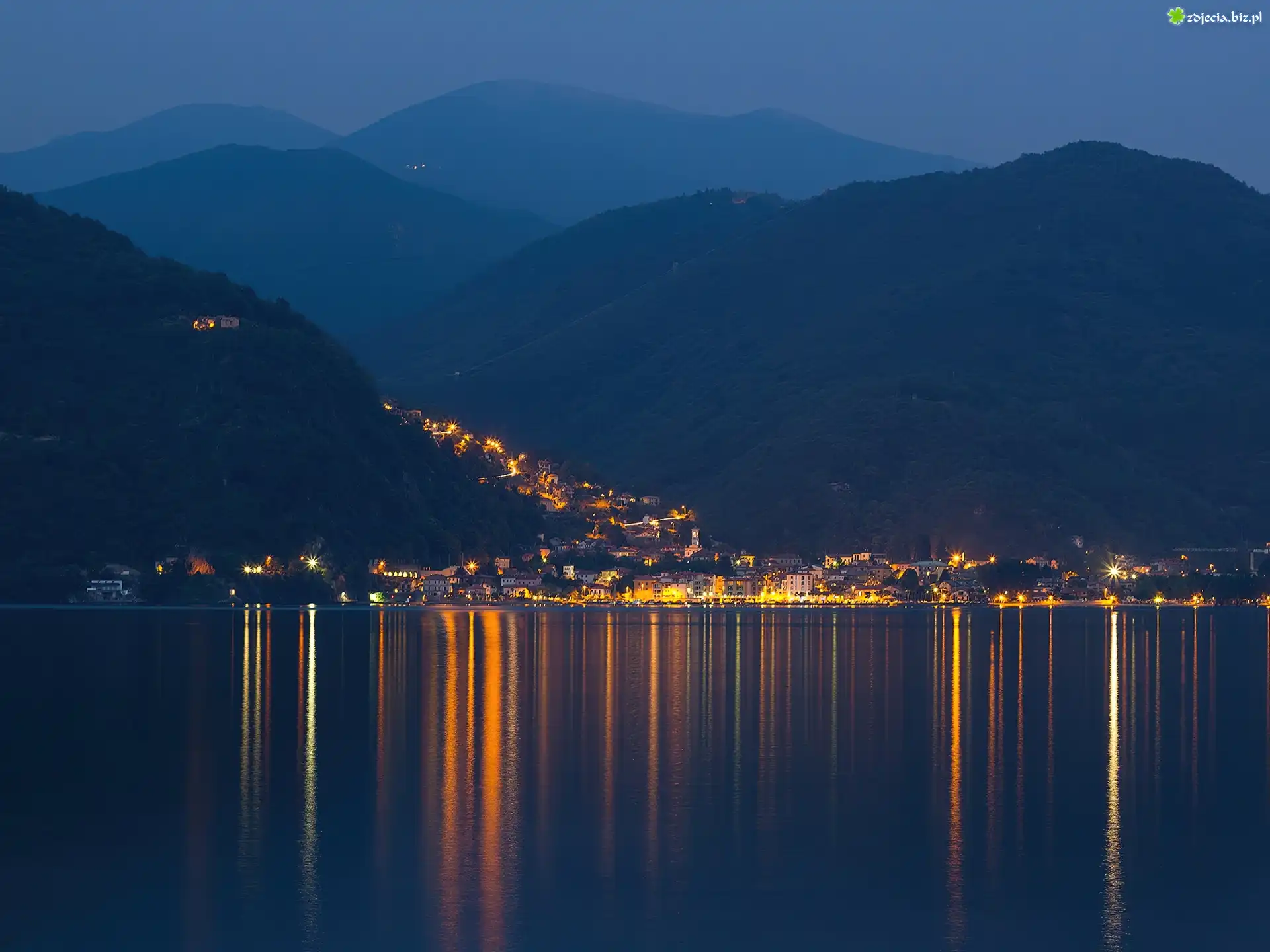 Zdjęcie, Włochy, Miasteczko, Nocą, Morze
