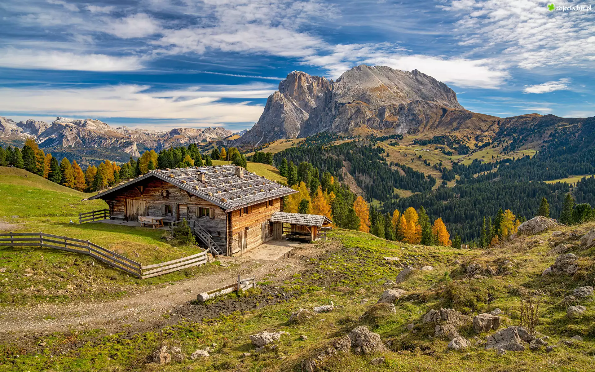 Zdjęcie Włochy, Południowy Tyrol, Góry, Dolomity, Sassolungo, Drzewa, Dom, Ogrodzenie, Kamienie