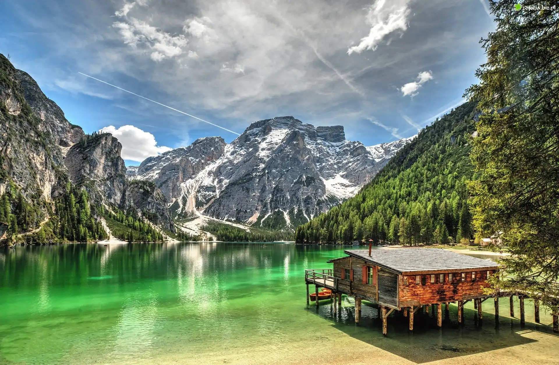 Zdjęcie Włochy, Południowy Tyrol, Jezioro Pragser Wildsee, Dolomity, Góry, Drewniany, Dom, Łódki, Drzewa, Pomost, Pale, Chmury |