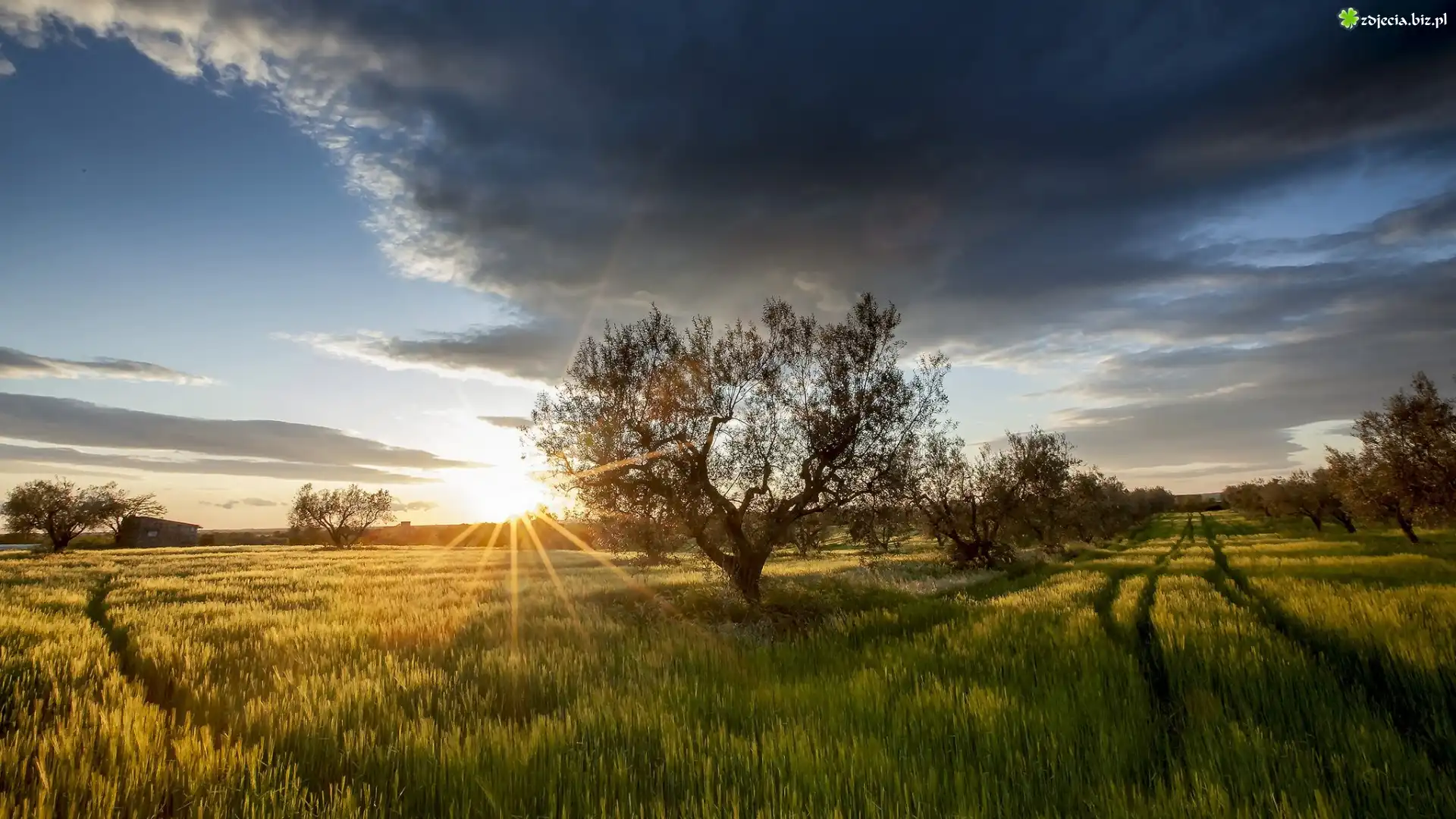 Zdjęcie, Włochy, Viterbo, Zachód słońca, Pole, Drzewa