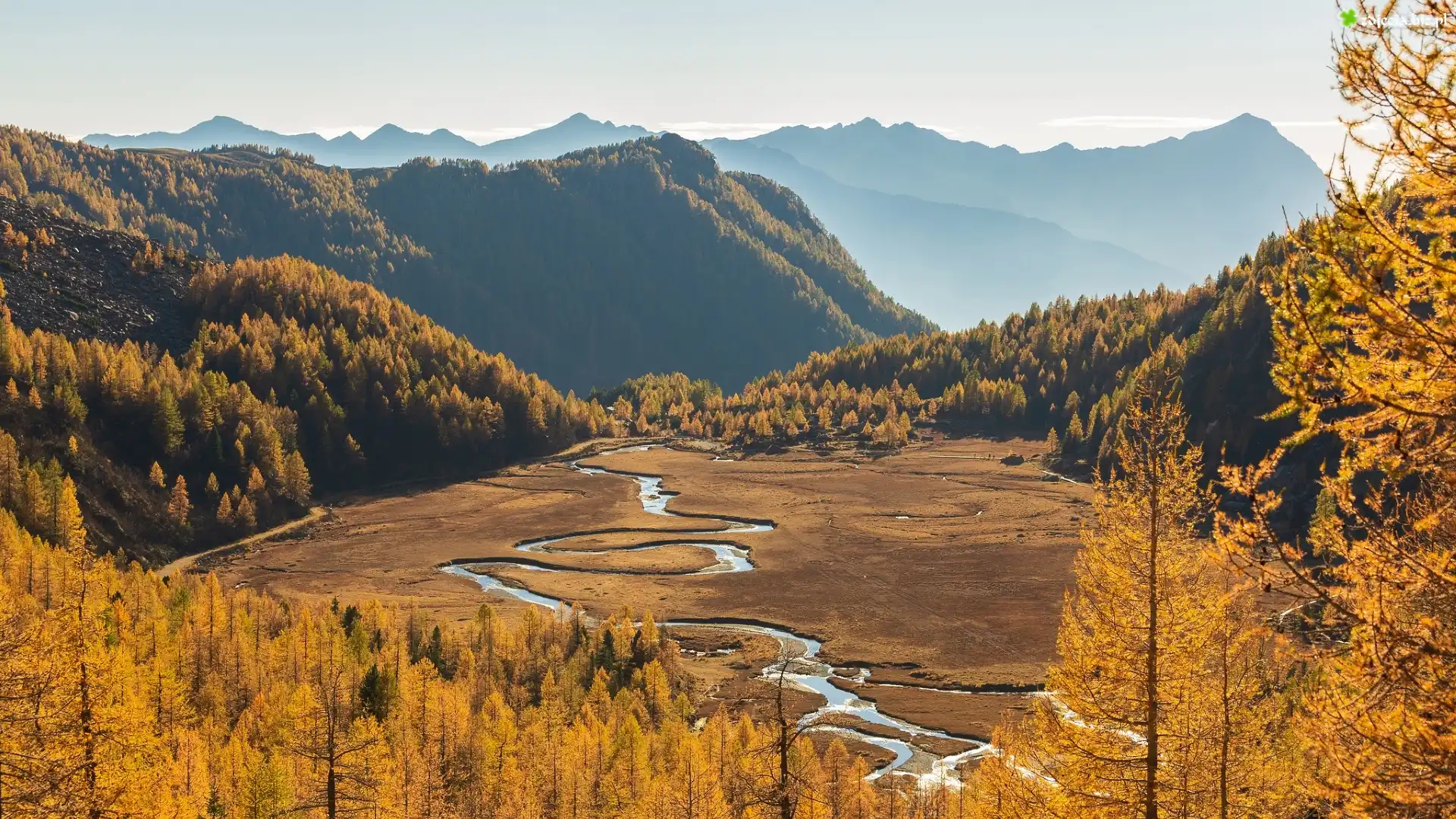 Zdjęcie Dolina Preda Rossa, Góry, Rzeka, Drzewa, Jesień, Prowincja Sondrio, Włochy