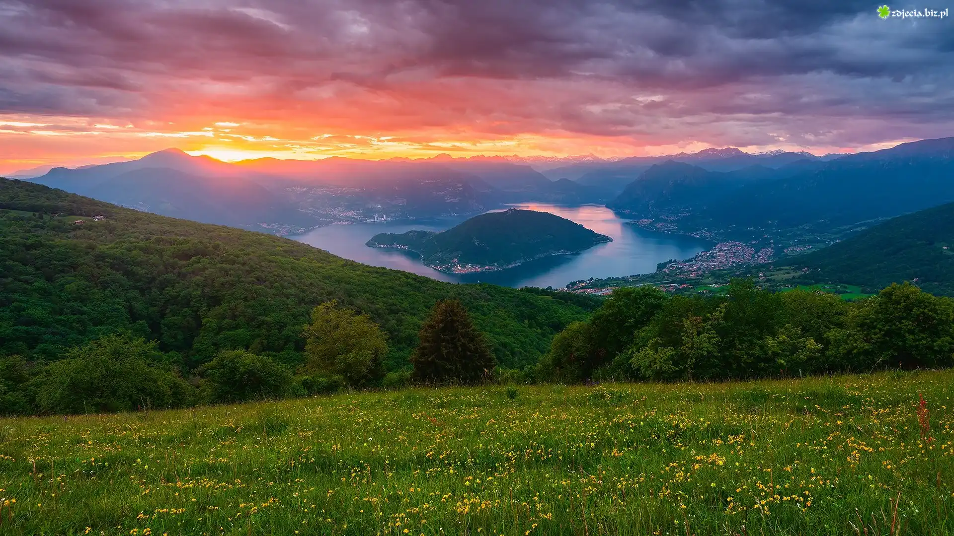 Zdjęcie Włochy, Jezioro, Lake Iseo, Góry, Alpy Lombardzkie, Dolina Val Camonica, Las, Drzewa, Domy, Zachód słońca, Chmury |