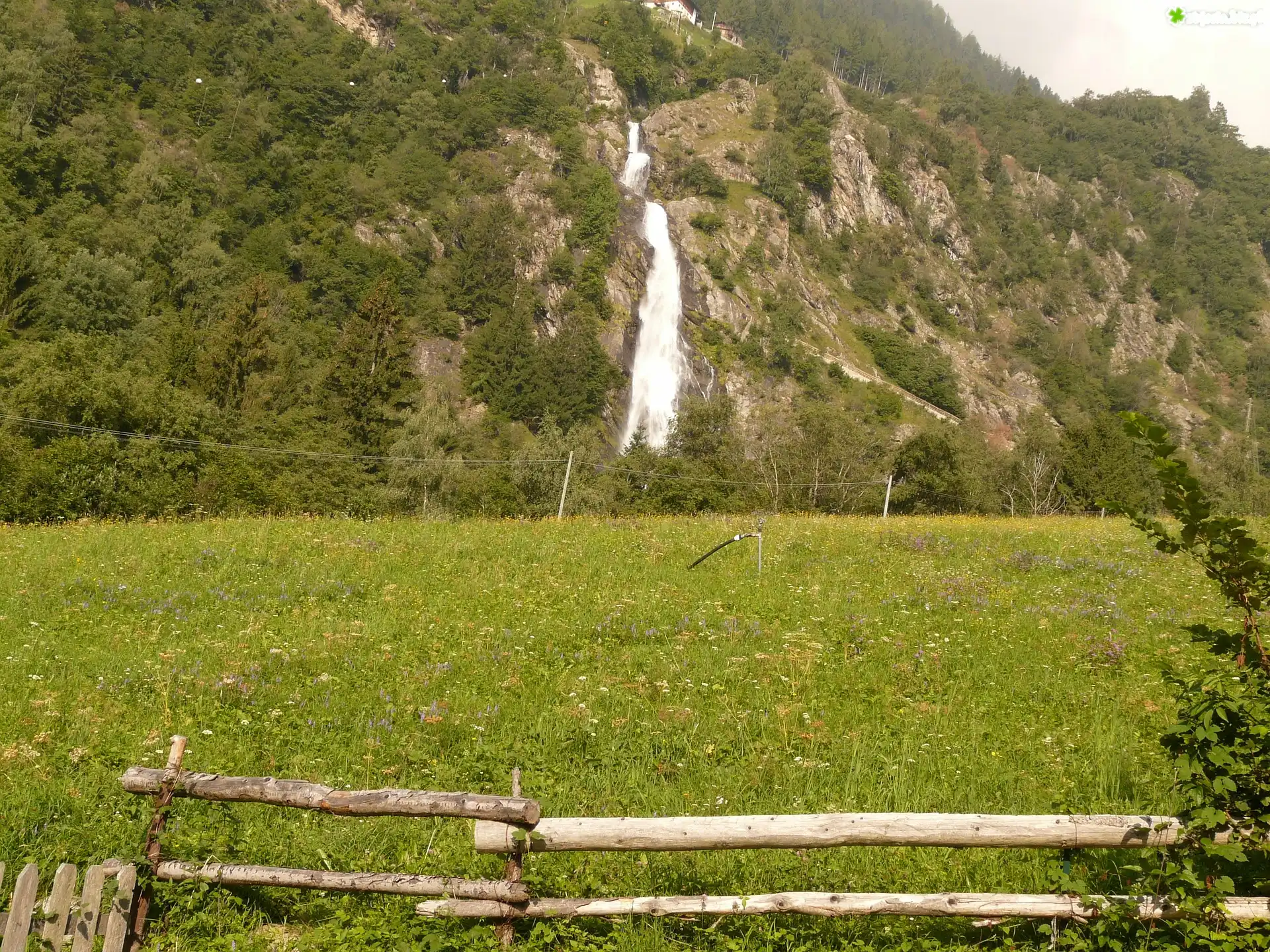 Zdjęcie Łąka, Ogrodzenie, Góry, Wodospad, Partschins Wasserfall, Południowy Tyrol, Włochy