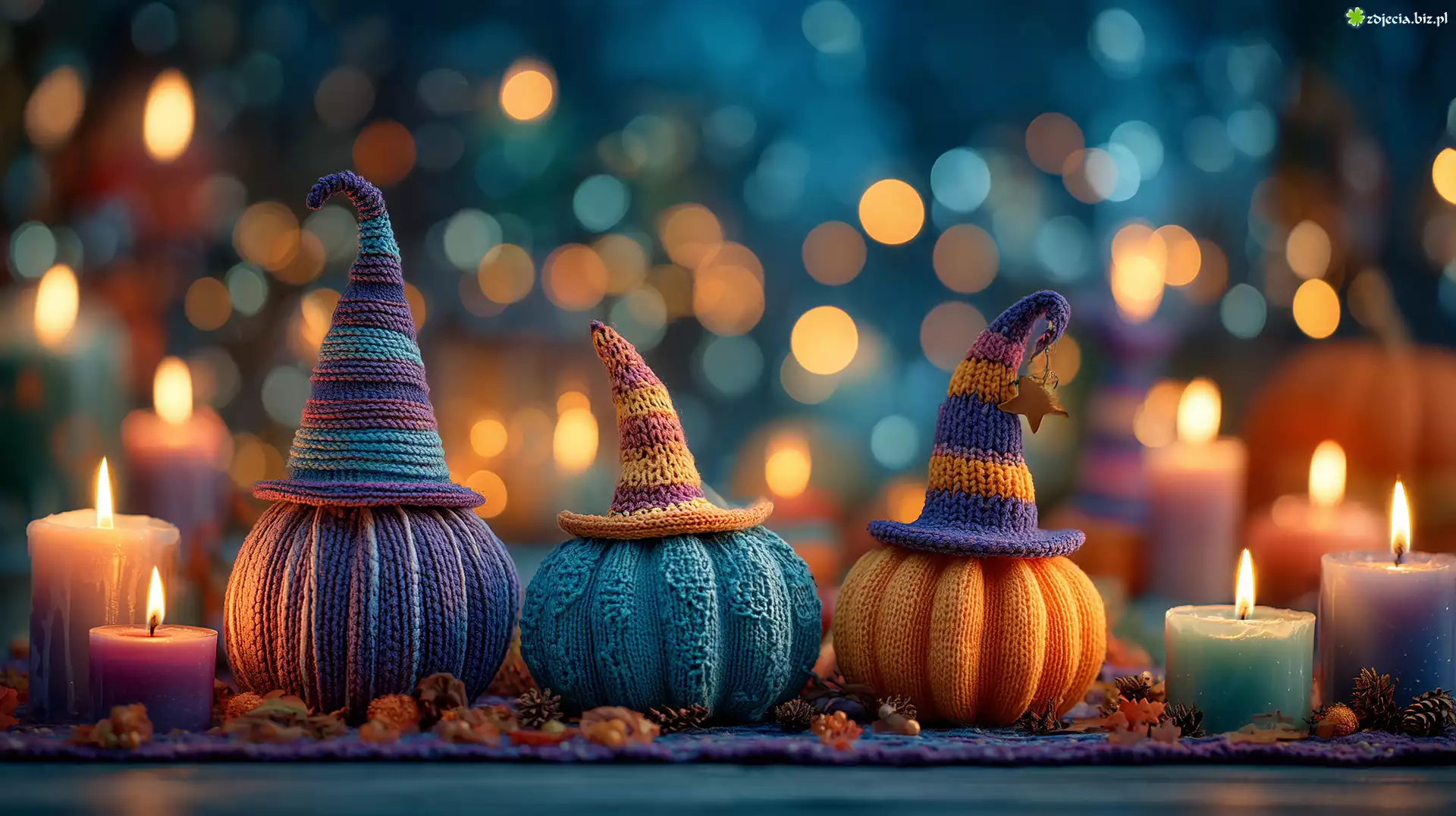 Zdjęcie Dynie, Włóczka, Świece, Bokeh, Grafika