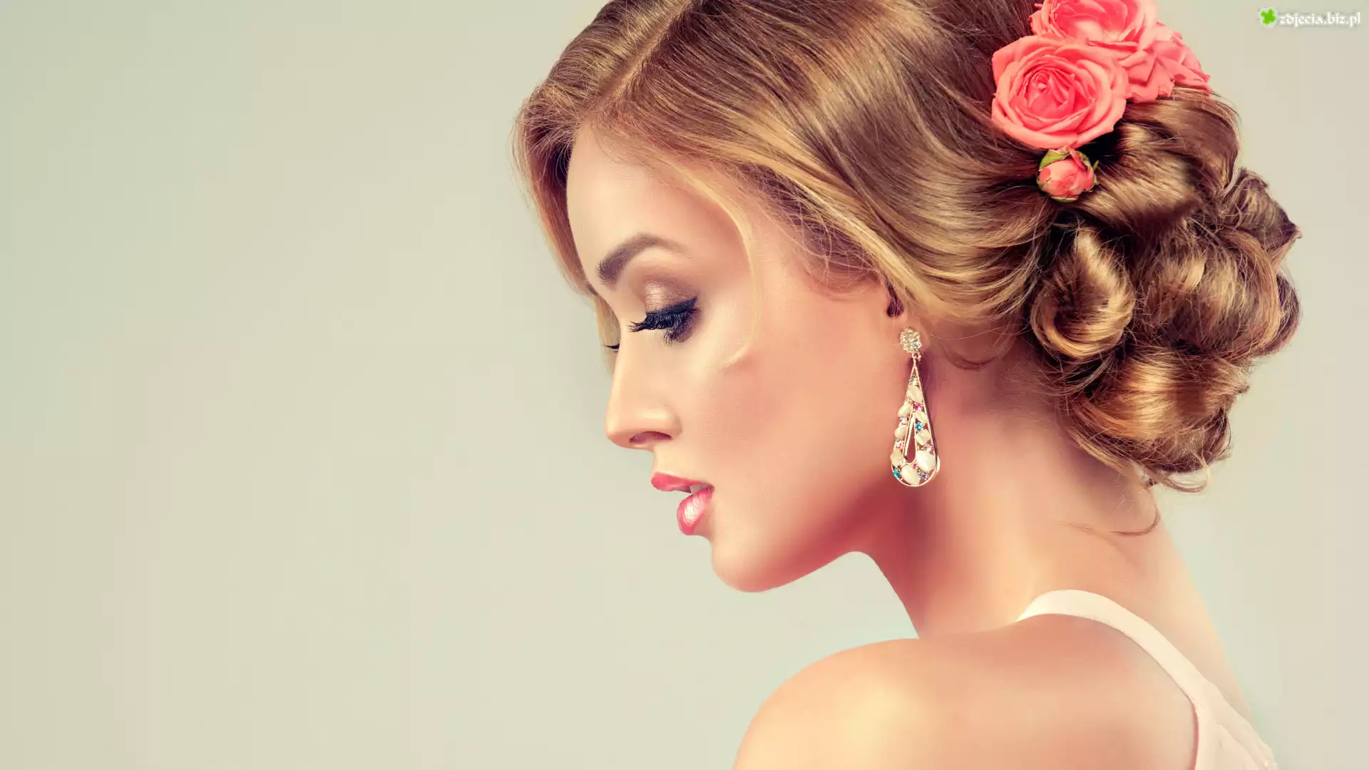 Zdjęcie Blondynka, Kobieta, Upięte, Włosy, Róże, Profil, Kolczyk