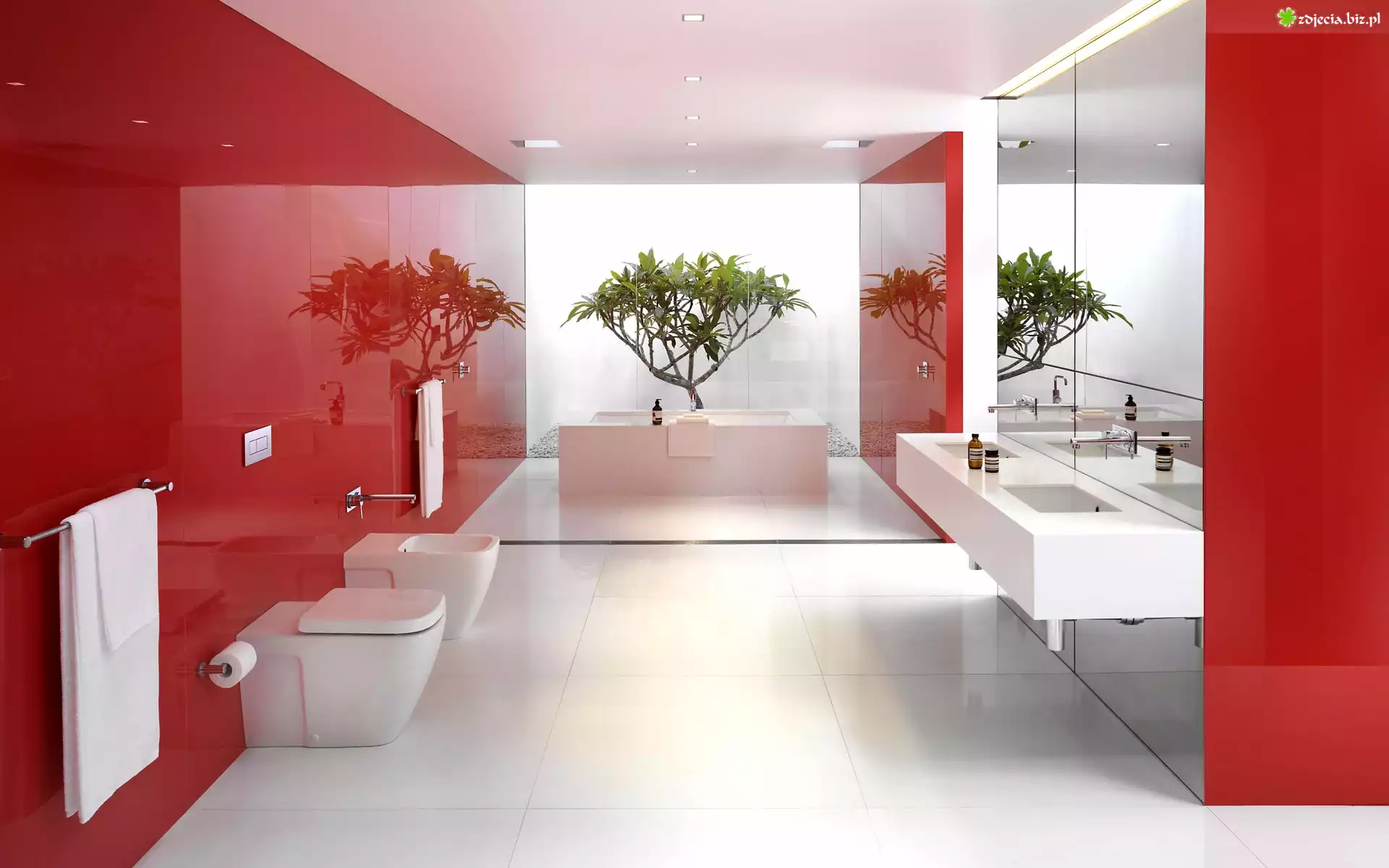 Zdjęcie Łazienka, Czerwona, Drzewko, Ręcznik, Oświetlenie