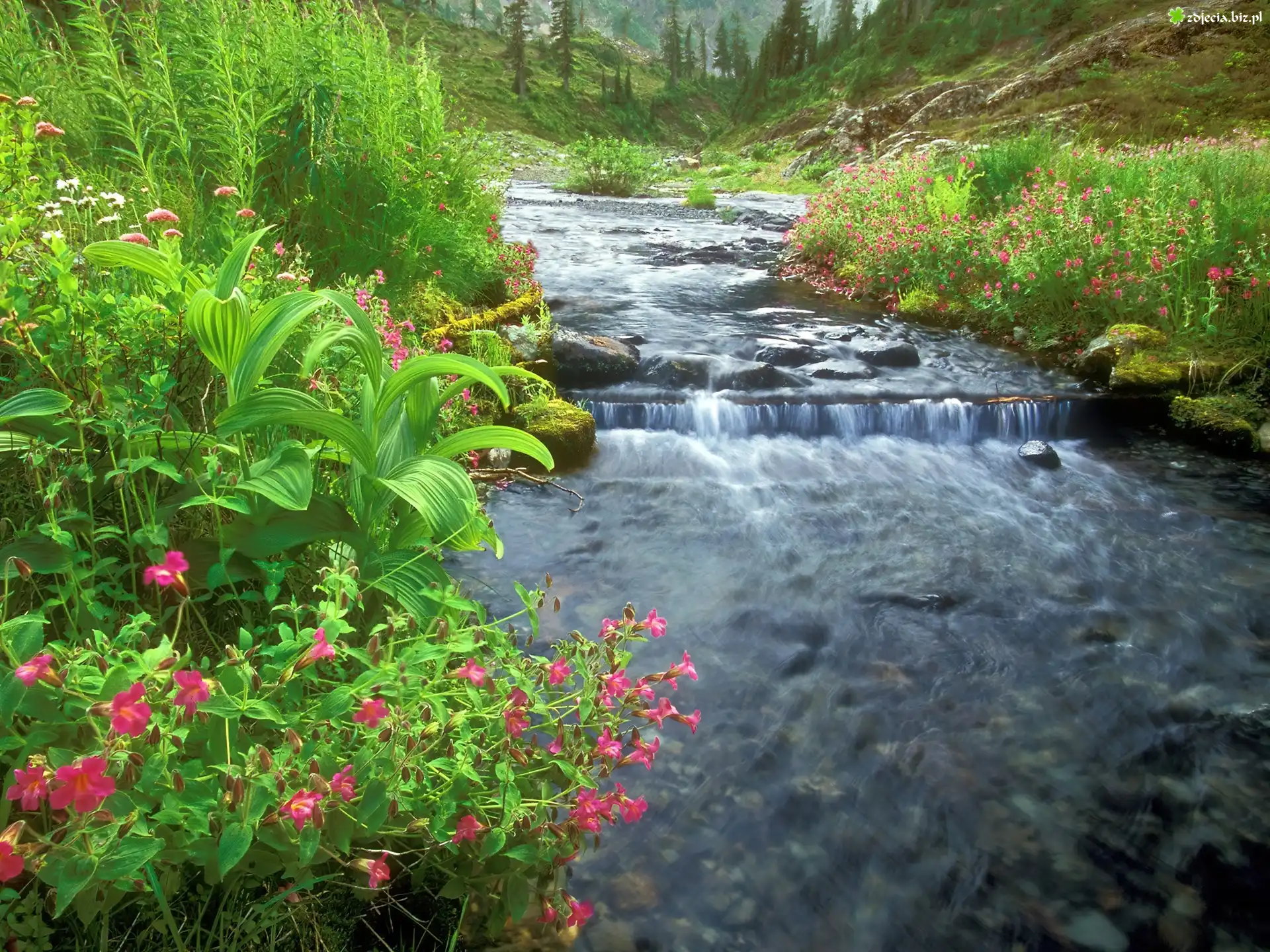 Zdjęcie Woda, Kamienie, Kwiatki, Zieleń