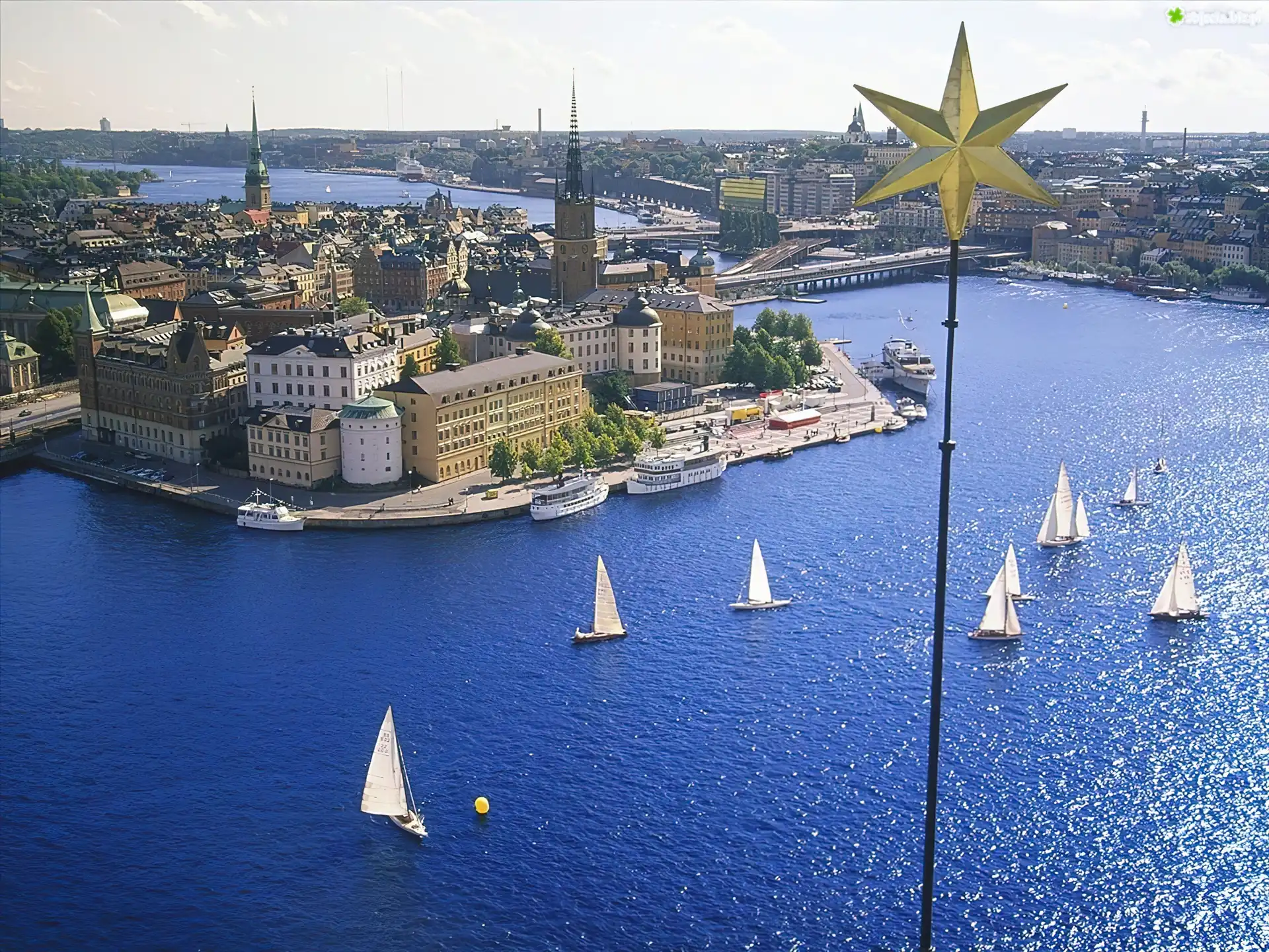 Zdjęcie Woda, Żaglówki, Zabudowania, Most, Gwiazda