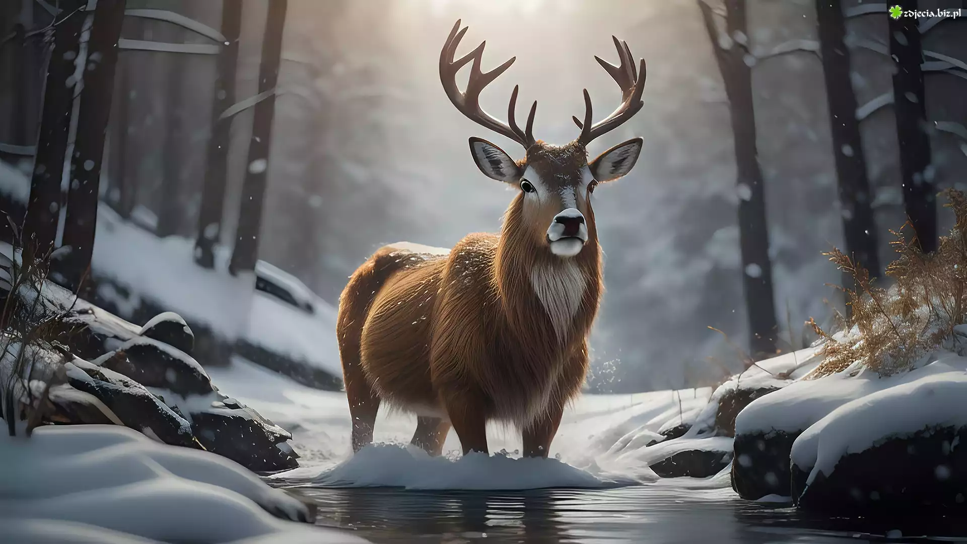 Zdjęcie Jeleń, Woda, Zima, Las, 2D