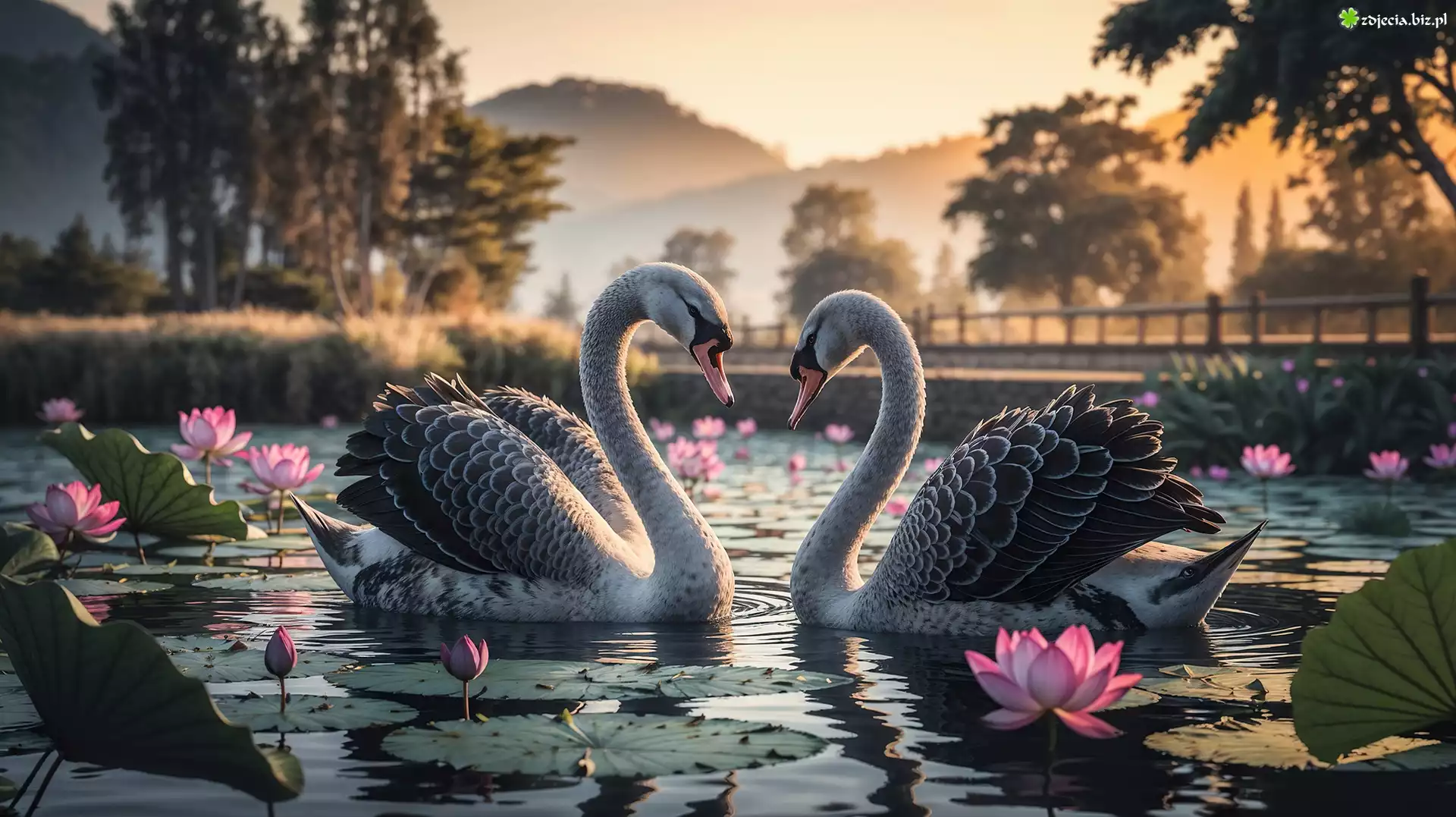 Zdjęcie, Łabędzie, Staw, Lilie wodne, Grafika AI