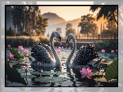 Zdjęcie Łabędzie, Staw, Lilie wodne, Grafika AI