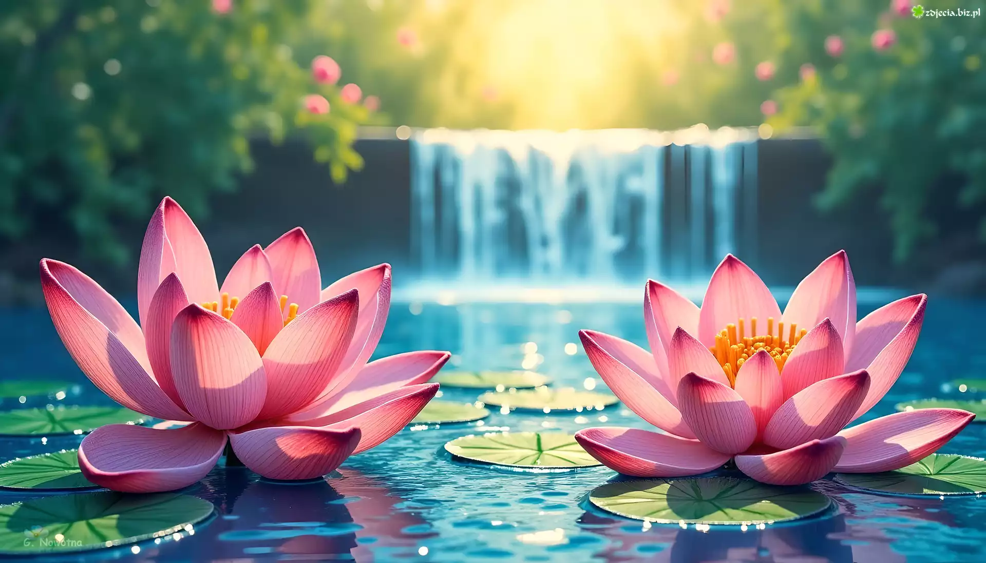 Zdjęcie Różowe, Dwie, Lilie wodne, Kwiaty, Wodospad, Grafika