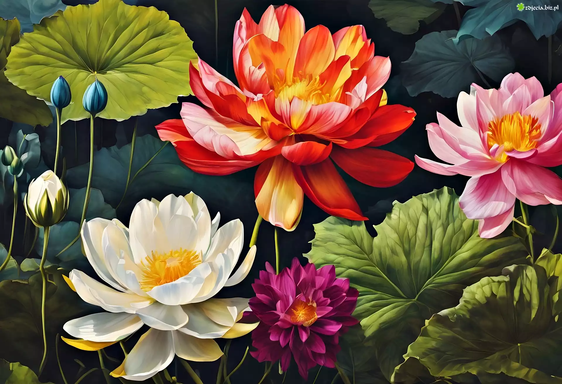 Zdjęcie Kolorowe, Kwiaty, Lilie wodne, Liście, Pąki, Grafika