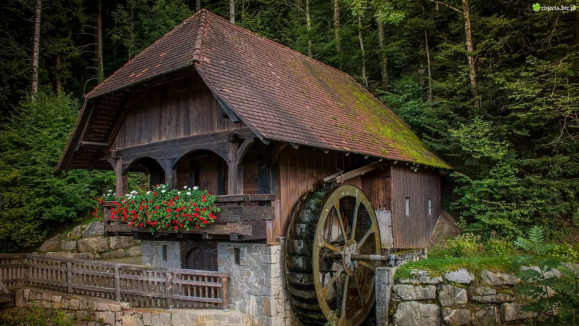Zdjęcie Młyn wodny, Okna, Balkon, Kwiaty, Płot, Las, Drzewa